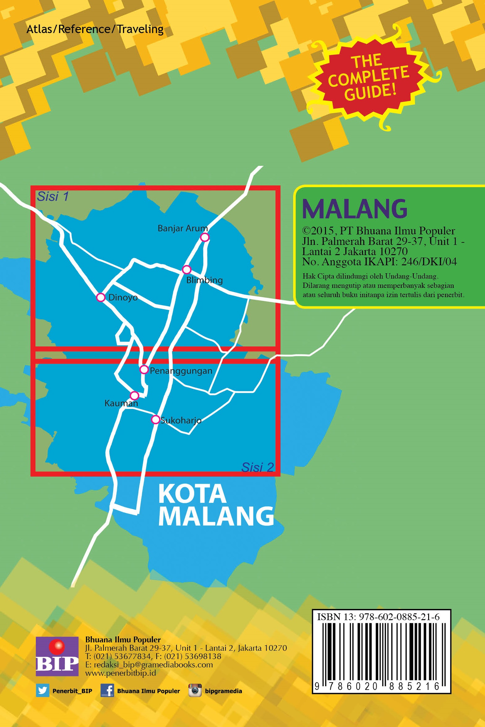 Buku ini berisi peta super lengkap, detail dan akurat jalan dan seluruh tempat penting di Kota Malang. Menyajikan peta dengan data paling baru termasuk informasi transportasi, bandara, sekolah, pusat perbelanjaan, taman dan tempat wisata. Paling mudah melakukan pencarian alamat dengan penunjuk nomor blok pada peta serta batas administrasi dan kode pos. Dibuat oleh Dr. Riadika Mastra yang telah menerbitkan peta mega best seller, Peta Megapolitan sebagai refrensi lokasi di jakarta paling akurat sejak tahun 2004.