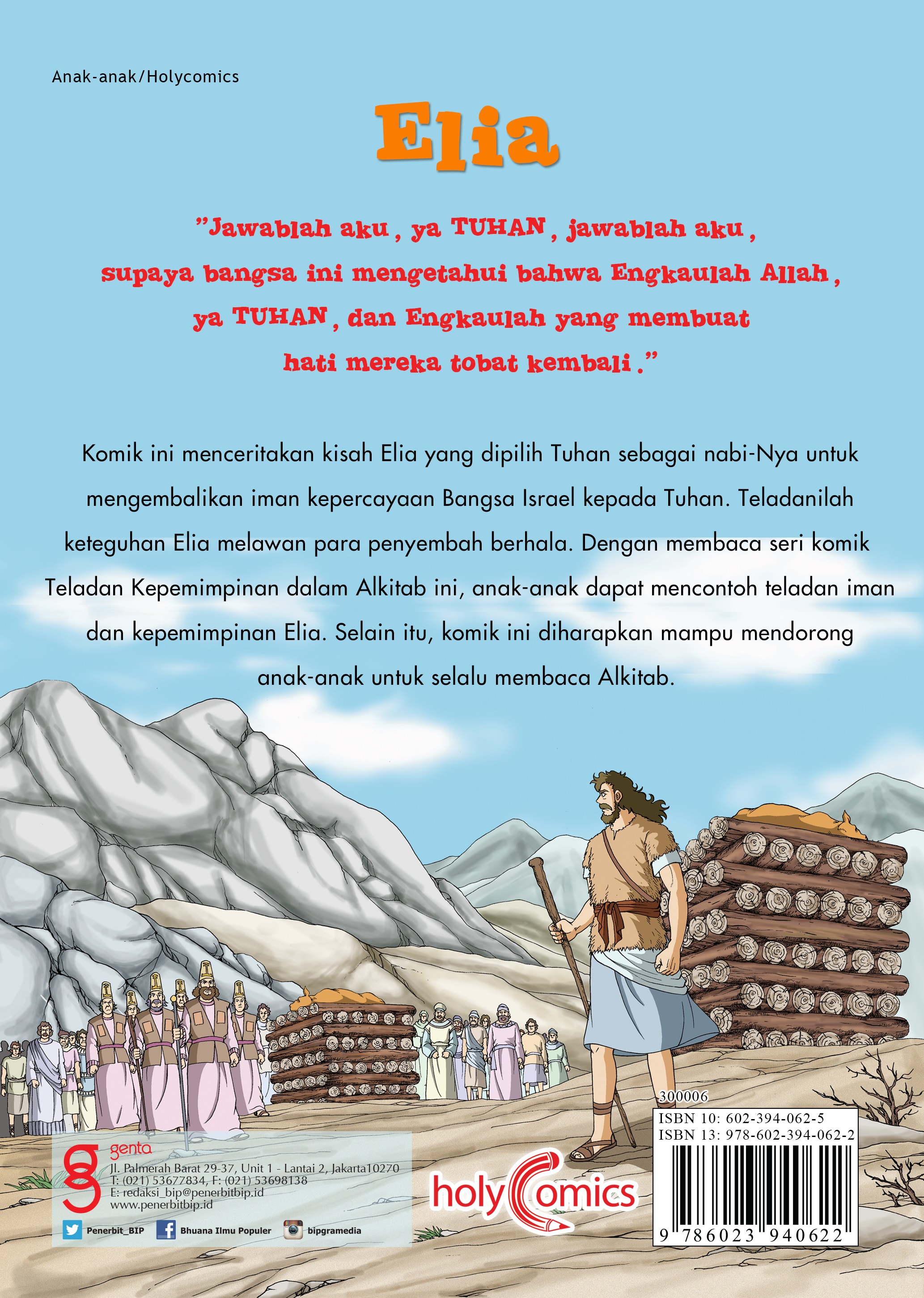 Komik ini menceritakan kisah Nabi Elia yang dengan berani membela Tuhan dan berhadapan dengan para nabi Baal dan permaisuri Izebel yang jahat. Berkat iman dan keberaniannya, bangsa Israel kembali menyembah Allah Israel yang hidup. Dengan membaca seri komik “Teladan Kepemimpinan dalam Alkitab” ini, anak-anak dapat mencontoh teladan iman Elia. Selain itu, komik diharapkan mendorong anak-anak untuk selalu membaca Alkitab.