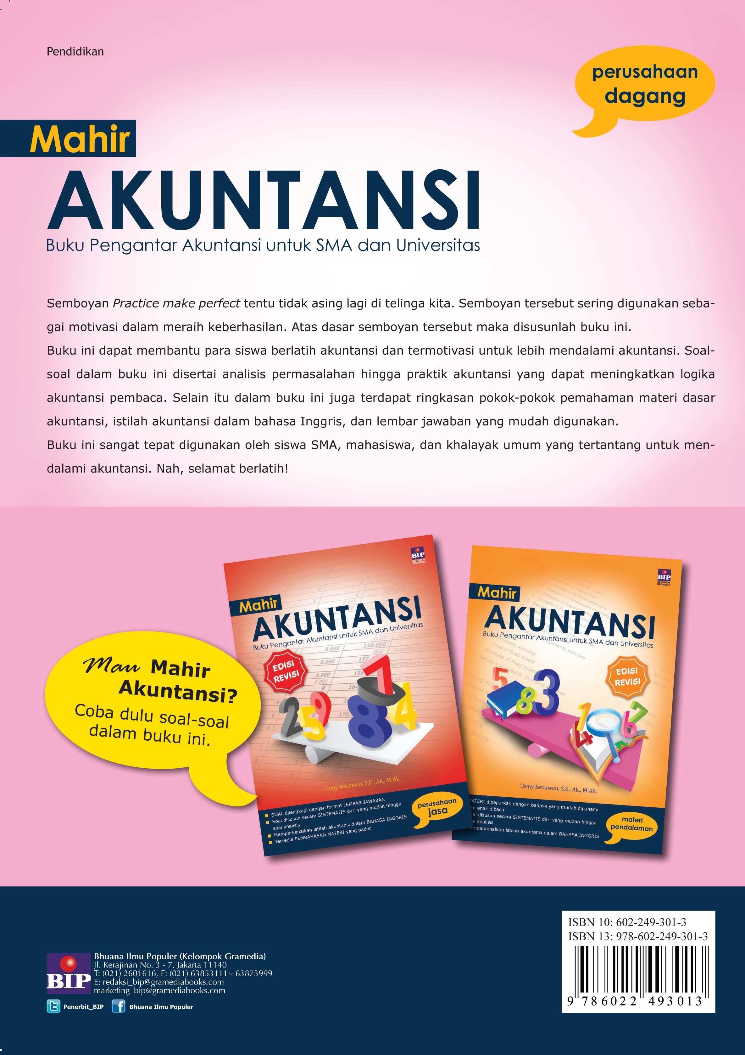 Semboyan “Practice make perfect” tentu tidak asing lagi di telinga kita. Semboyan tersebut sering digunakan sebagai motivasi dalam meraih keberhasilan. Atas dasar semboyan tersebut maka disusunlah buku ini. Buku ini dapat membantu para siswa berlatih akuntansi dan termotivasi untuk lebih mendalami akuntansi. Soal-soal dalam buku ini disertai analisis permasalahan hingga praktik akuntansi yang dapat meningkatkan logika akuntansi pembaca. Selain itu, dalam buku ini juga terdapat ringkasan pokok-pokok pemahaman materi dasar akuntansi, istilah akuntansi dalam bahasa Inggris, dan lembar jawaban yang mudah digunakan. Buku ini sangat tepat digunakan oleh siswa SMA, mahasiswa, dan khalayak umum yang tertantang untuk mendalami akuntansi. Buku ini dapat membantu para siswa berlatih akuntansi dan termotivasi untuk lebih mendalami akuntansi. Soal-soal dalam buku ini disertai analisis permasalahan hingga praktik akuntansi yang dapat meningkatkan logika akuntansi pembaca. Selain itu, dalam buku ini juga terdapat pembahasan pokok-pokok pemahaman materi dasar akuntansi, istilah akuntansi dalam bahasa Inggris, dan lembar jawab yang mudah digunakan. Nah, selamat berlatih!