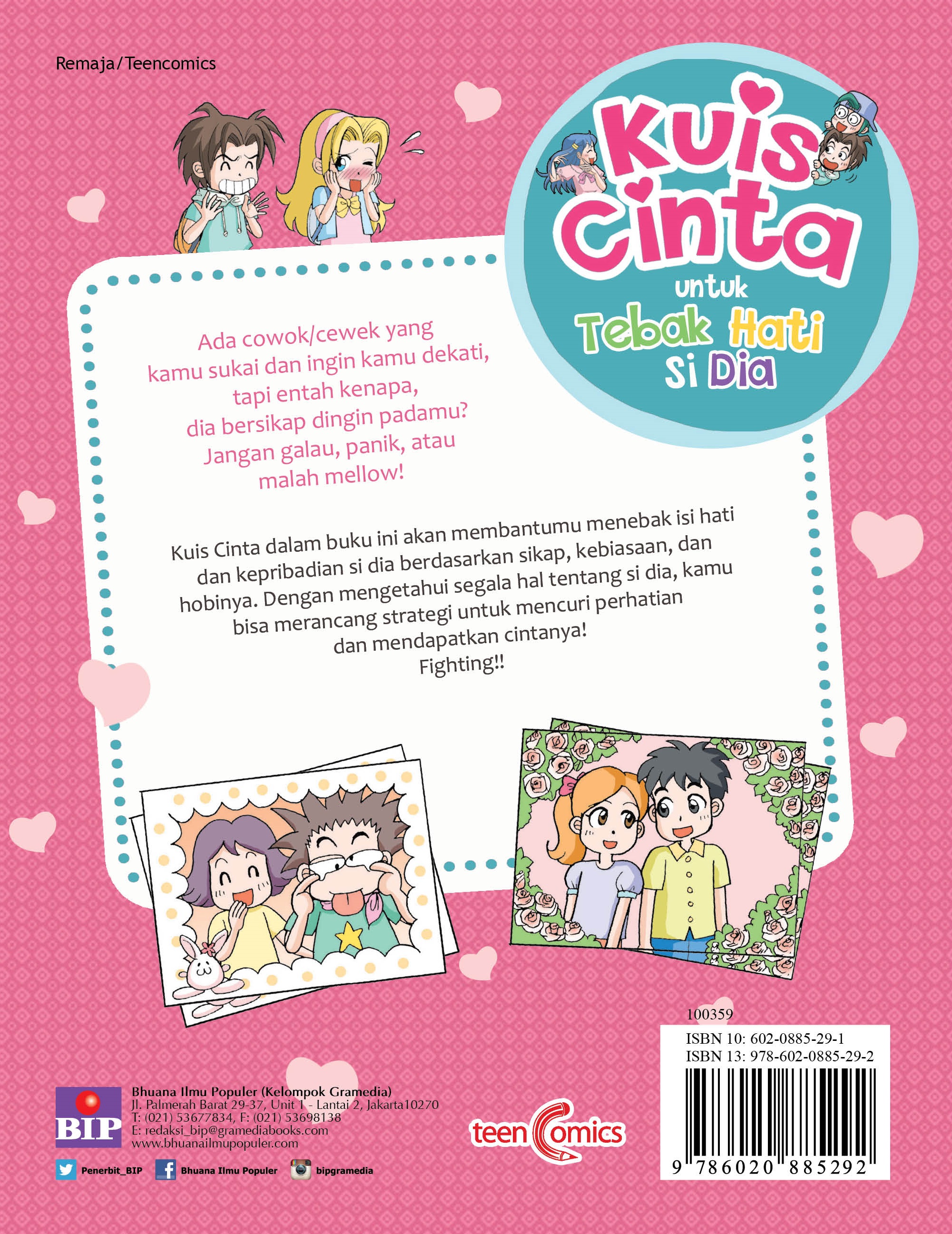 Ada cowok/cewek yang ingin kamu dekati, tapi entah kenapa dia bersikap dingin kepadamu? Jangan galau, panik, atau malah mellow! Kuis Cinta dalam buku ini akan membantumu menebak isi hati dan kepribadian si dia berdasarkan sikap, kebiasaan, dan hobinya. Dengan mengetahui segala hal tentang si dia, kamu bisa merancang strategi untuk mendapatkan cintanya! Fightinggg!
