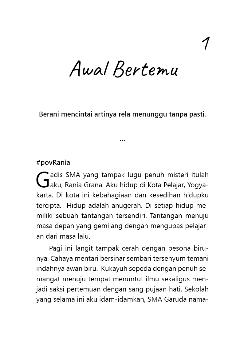 Gadis SMA yang tampak lugu penuh misteri itulah aku, Rania Grana. Aku hidup di Kota Pelajar, Yogyakarta. Di kota ini kebahagiaan dan kesedihan hidupku tercipta. Hidup adalah anugerah. Di setiap hidup memiliki sebuah tantangan tersendiri. Tantangan menuju masa depan yang gemilang dengan mengupas pelajaran dari masa lalu.