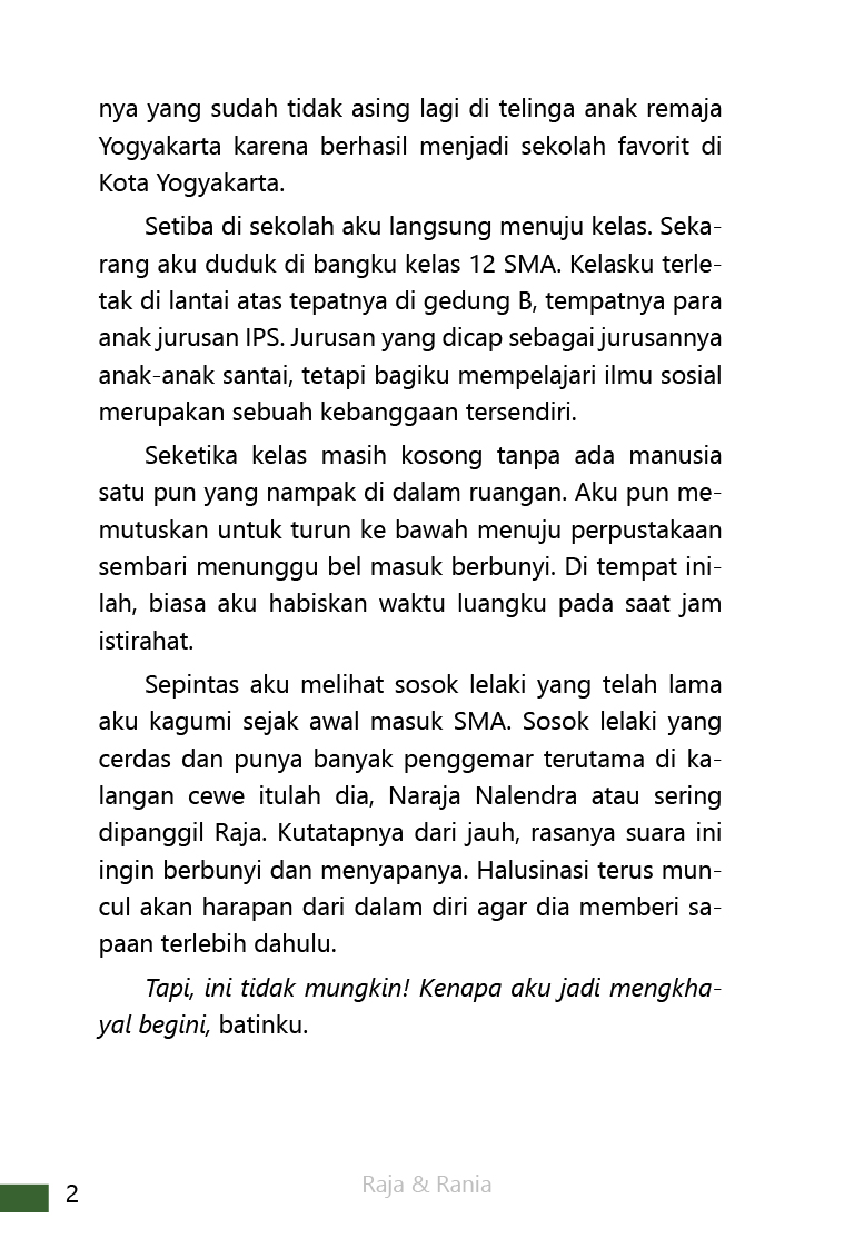 Karya pertama saya, Raja & Rania ditulis pada tahun 2018, tetapi saya baru mengajukan ke penerbit ketika tahun 2021. Perasaan senang dan bahagia ketika naskah yang telah lama saya tulis bisa diterbitkan dan dibaca oleh semua orang. Pada setiap bab dalam karya ini memiliki makna tersendiri bagi setiap orang yang membacanya. Lahirnya karya Raja & Rania merupakan sebuah langkah awal bagi saya untuk terus melahirkan karya-karya baru di kemudian hari.