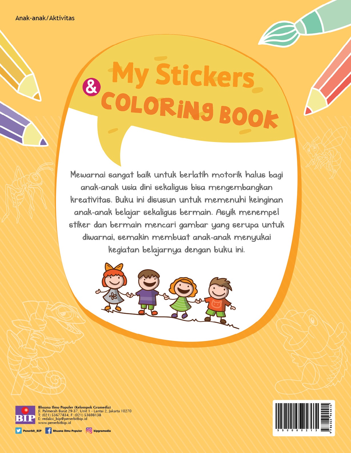 Mewarnai sangat baik untuk berlatih motorik halus bagi anak-anak usia dini sekaligus bisa mengembangkan kreativitas. Buku ini disusun untuk memenuhi keinginan anak-anak belajar sekaligus bermain. Asyik menempel stiker dan bermain mencari gambar yang serupa untuk diwarnai, semakin membuat anak-anak menyukai kegiatan belajarnya dengan buku ini.