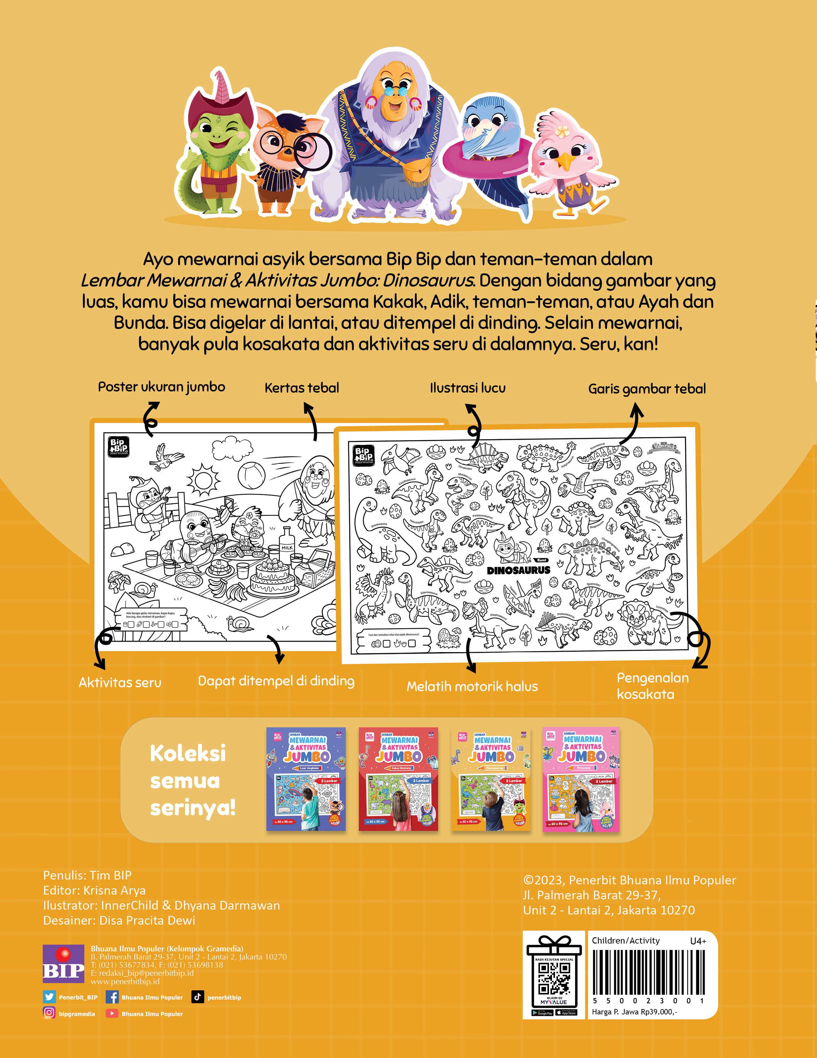 Ayo mewarnai asyik bersama Bip Bip dan teman-teman dalam Lembar Mewarnai Jumbo. Dengan bidang gambar yang luas, kamu bisa mewarnai bersama kakak, adik, teman-teman, atau ayah dan bunda. Bisa digelar di lantai, atau ditempel di dinding. Seru, kan! Selain mewarnai banyak pula aktivitas seru yang bisa kamu lakukan.