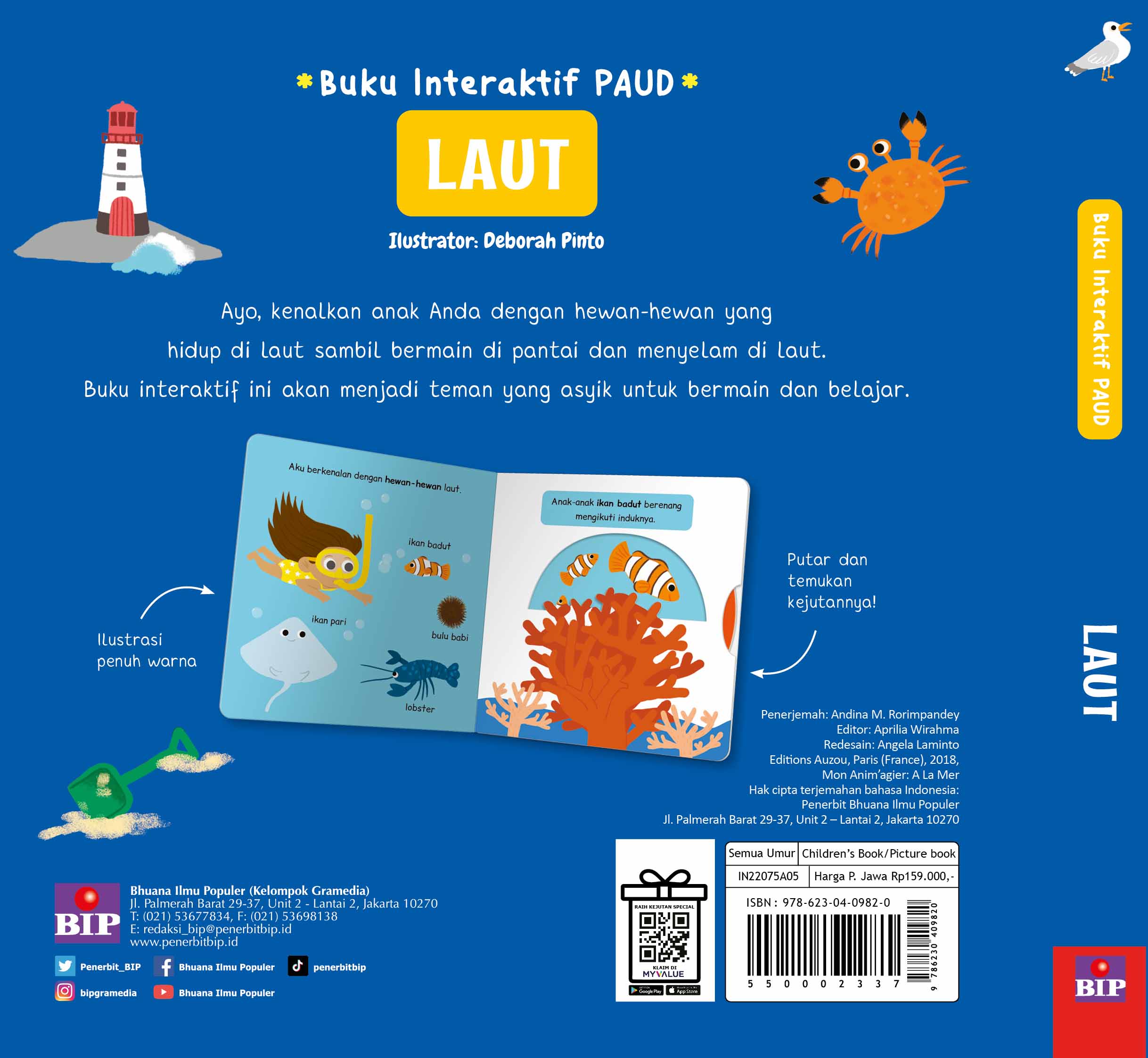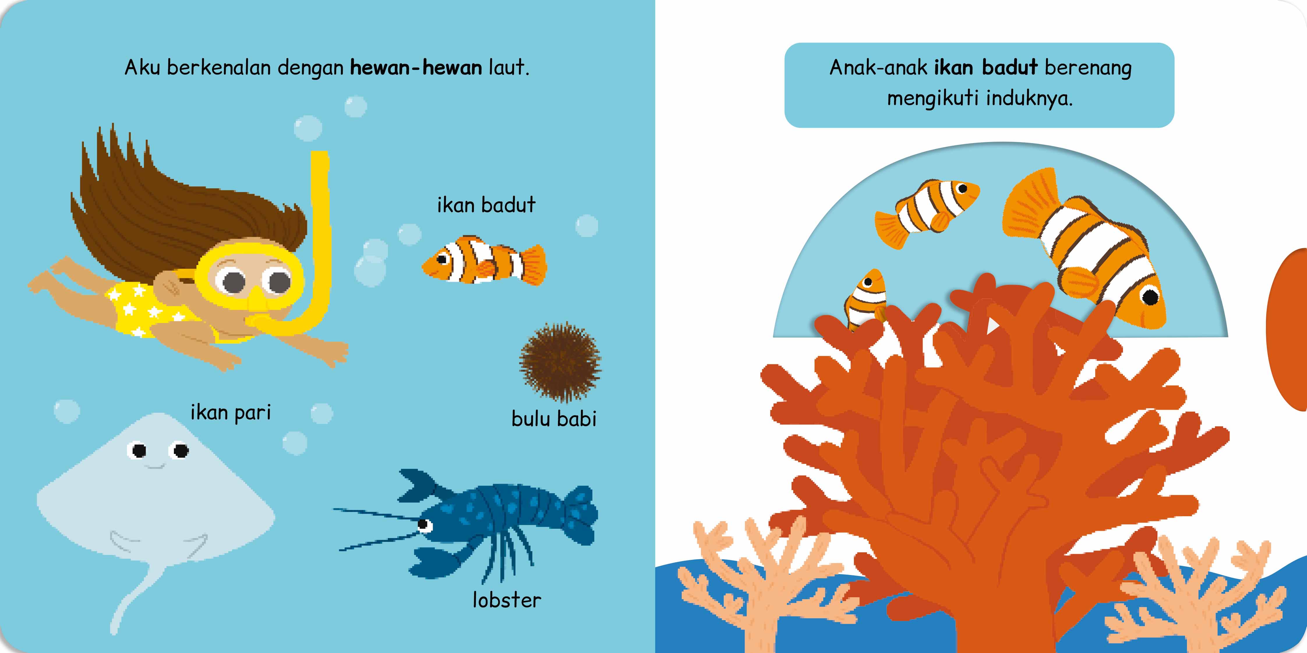 Ayo, kenalkan anak Anda dengan hewan-hewan yang hidup di Laut sambil bermain di pantai dan menyelam di Laut. Buku interaktif ini akan menjadi teman yang asyik untuk bermain dan belajar.