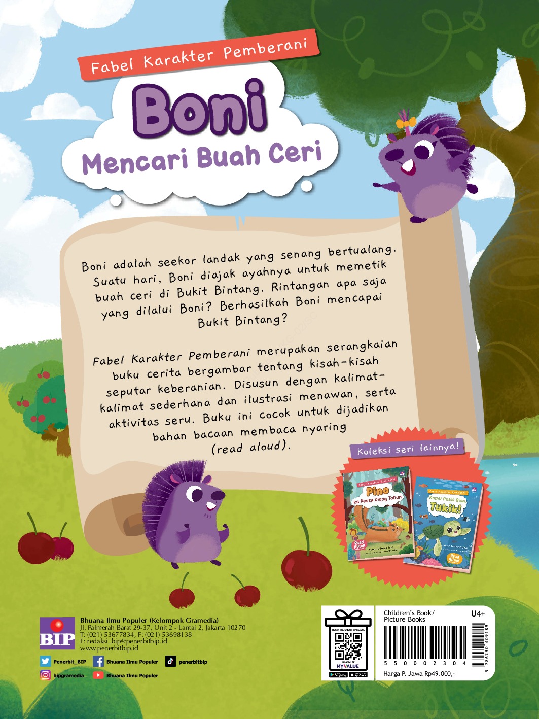 Buku ini bercerita mengenai Boni, seekor landak yang senang berpetualang. Suatu hari, Boni diajak ayahnya untuk memetik buah ceri di Bukit Bintang. Rintangan apa saja yang dilalui Boni? Berhasilkah Boni mencapai Bukit Bintang? Fabel Karakter Pemberani merupakan serangkaian buku cerita bergambar tentang kisah-kisah seputar keberanian. Disusun dengan kalimat-kalimat sederhana dan ilustrasi menawan, buku ini cocok untuk dijadikan bahan bacaan untuk membaca nyaring (read aloud).