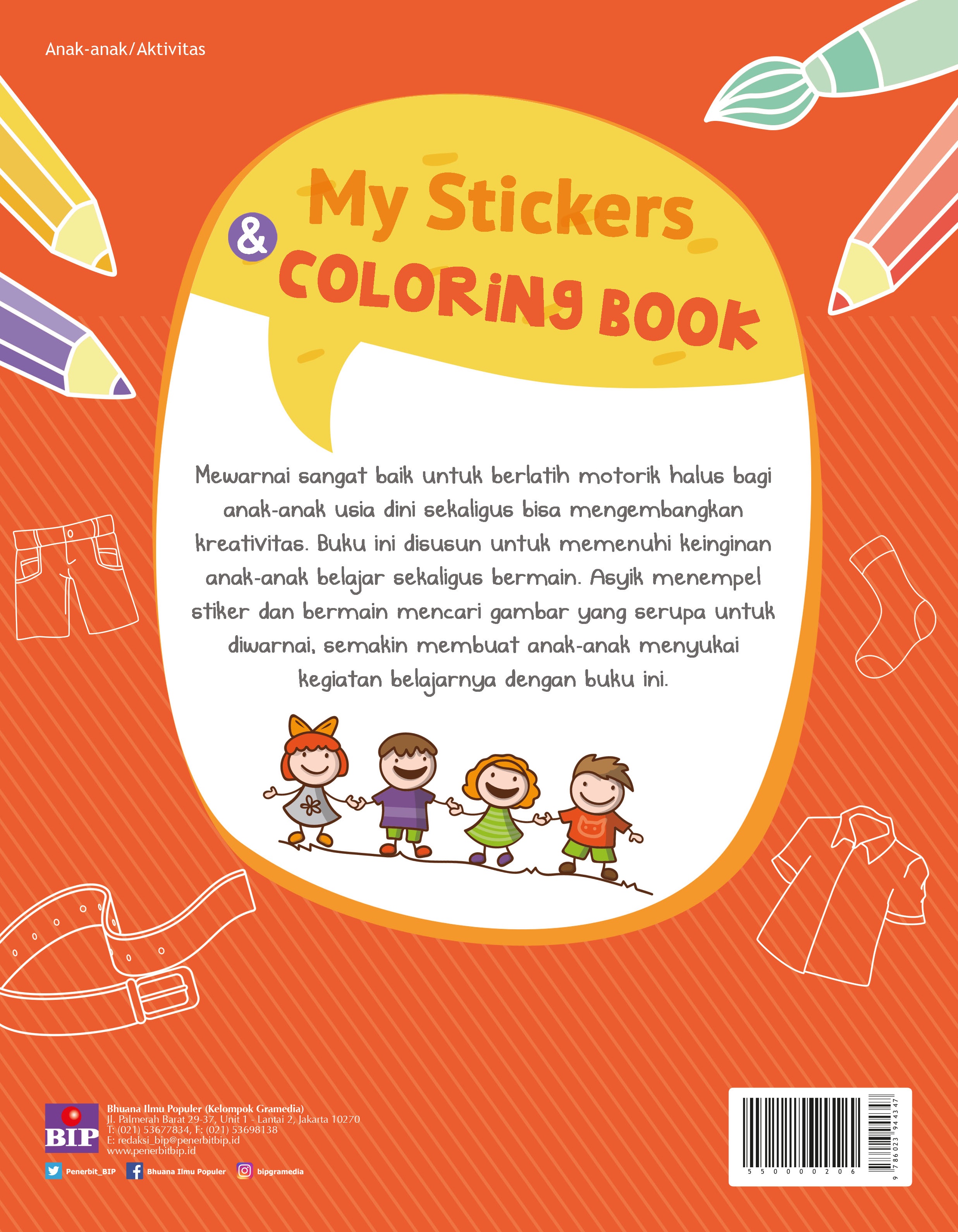 Mewarnai sangat baik untuk berlatih motorik halus bagi anak-anak usia dini sekaligus bisa mengembangkan kreativitas. Buku ini disusun untuk memenuhi keinginan anak-anak belajar sekaligus bermain. Asyik menempel stiker dan bermain mencari gambar yang serupa untuk diwarnai, semakin membuat anak-anak menyukai kegiatan belajarnya dengan buku ini.