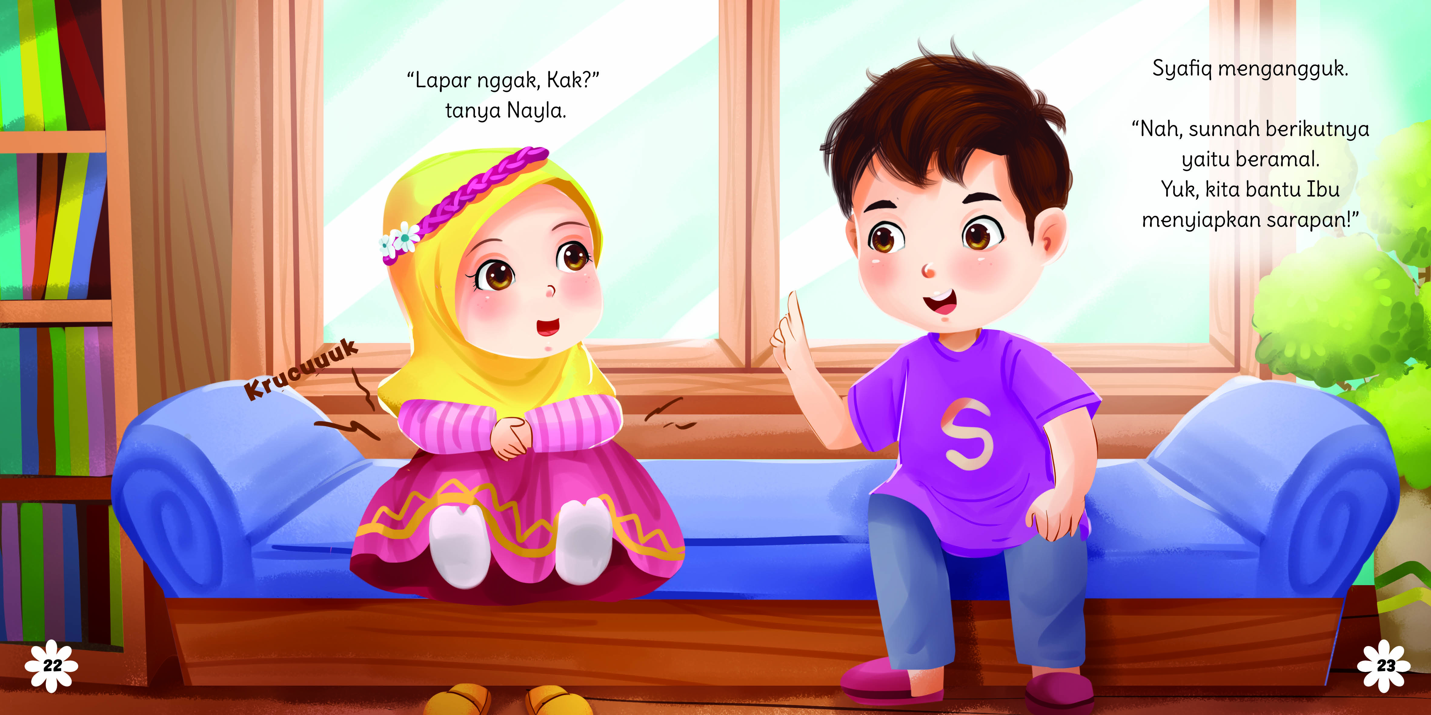 Hari ini hari libur. Syafiq hampir saja tidur lagi. Untung, Nayla mengingatkan kakaknya. Syafiq pun bangkit dan mulai melakukan bermacam-macam sunnah pagi, diikuti oleh Nayla. Apa saja yang mereka lakukan, ya?