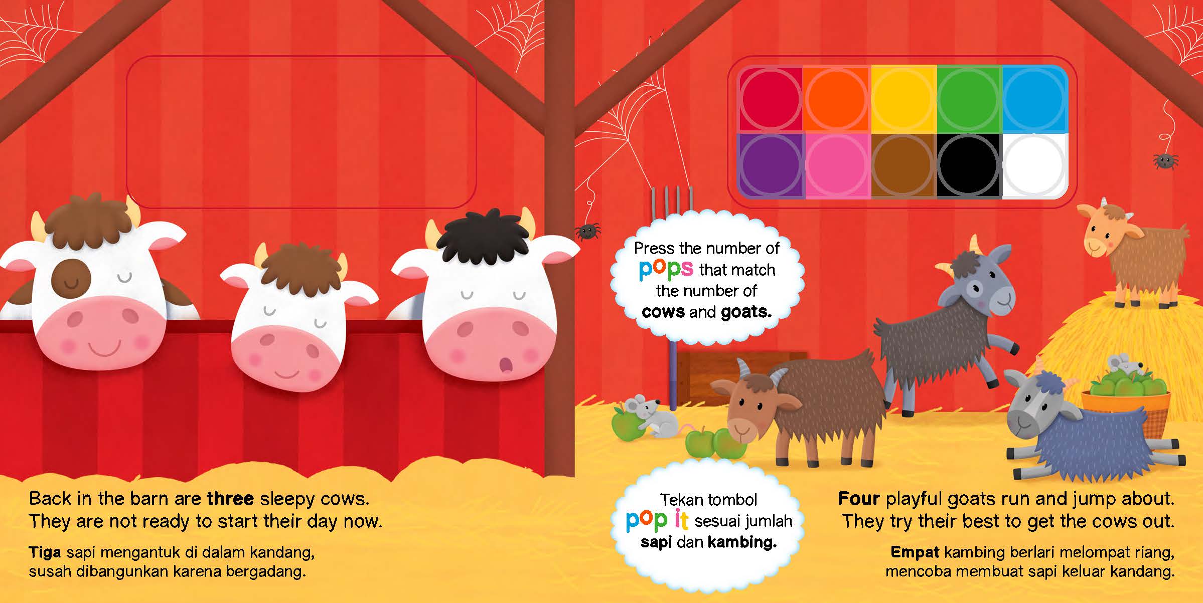 Ayo berkenalan dengan hewan-hewan di peternakan sambil mengamati apa yang mereka lakukan sepanjang hari. Hitunglah hewan yang kamu temui dan tekan tombol pop it sesuai jumlahnya.