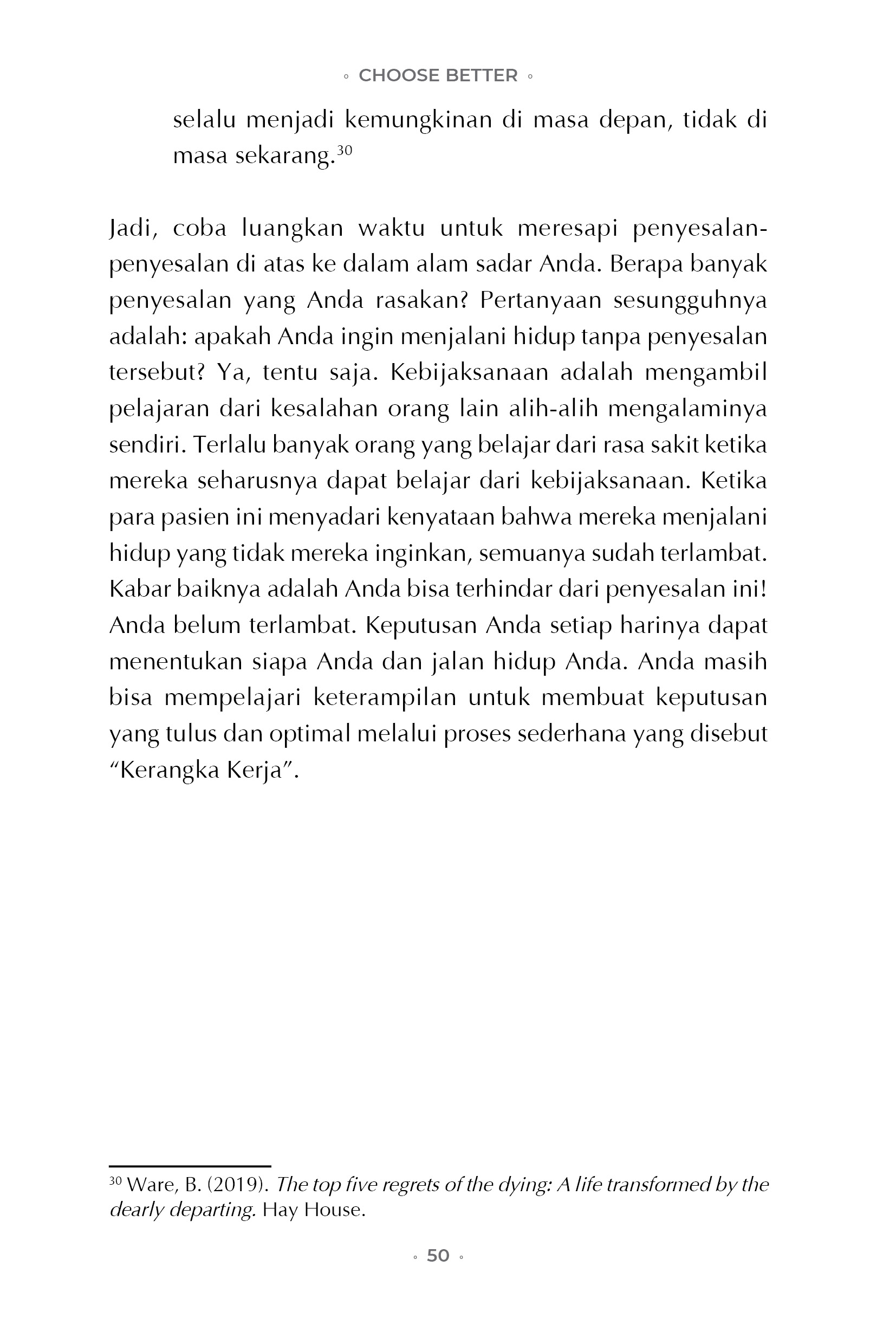 Choose Better berisi berbagai prinsip dan panduan praktis, disebut Kerangka Kerja, yang berguna dalam membuat keputusan yang lebih baik dalam hidup. Buku ini mengajarkan bagaimana cara agar kita dapat melihat lebih jauh akan segala pilihan yang ada