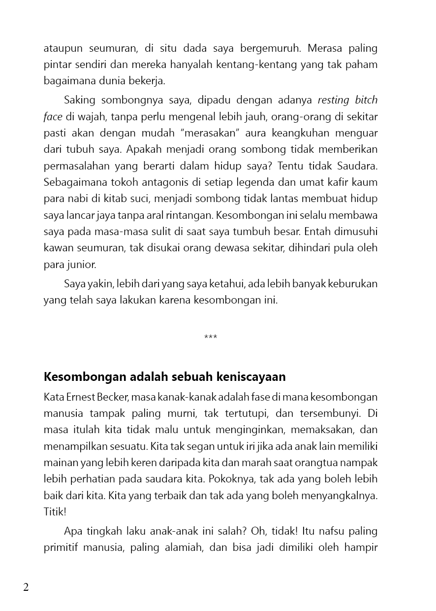 Buku ini ditulis sebagai kitab pengakuan dosa dari orang sombong yang menyombongkan kesombongannya. Sadar akan kecenderungan buruknya, orang sombong ini kemudian mencoba menjabarkan kecongkakannya, merefleksikan beberapa anekdot harian soal keangkuhannya, menarasikan bagian mana yang salah dari dirinya, dan mengulik sisi mana yang harus dikoreksi.
