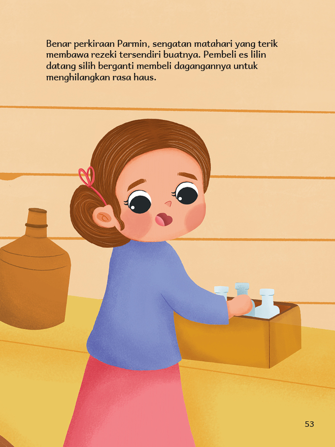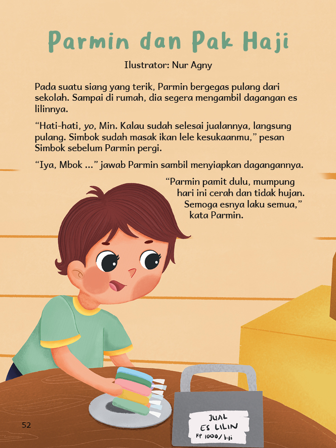 Di siang yang terik, Parmin menjajakan es lilin buatan ibunya. Ternyata banyak yang datang untuk membeli dagangannya. Sampai-sampai Parmin tidak mendengar azan zuhur sudah berkumandang. Karena tidak segera masuk ke masjid untuk salat, Pak Haji pun mengingatkan Parmin untuk berhenti sebentar. Tapi Pak Haji malah menasihatinya. Apa ya nasihat dari Pak Haji untuk Parmin?