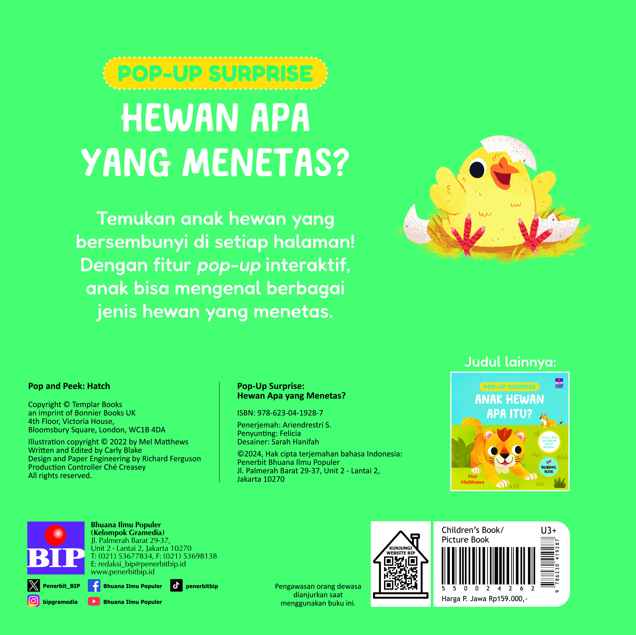 Temukan anak hewan yang bersembunyi di setiap halaman! Dengan fitur pop-up interaktif, anak bisa mengenal berbagai jenis hewan yang menetas.