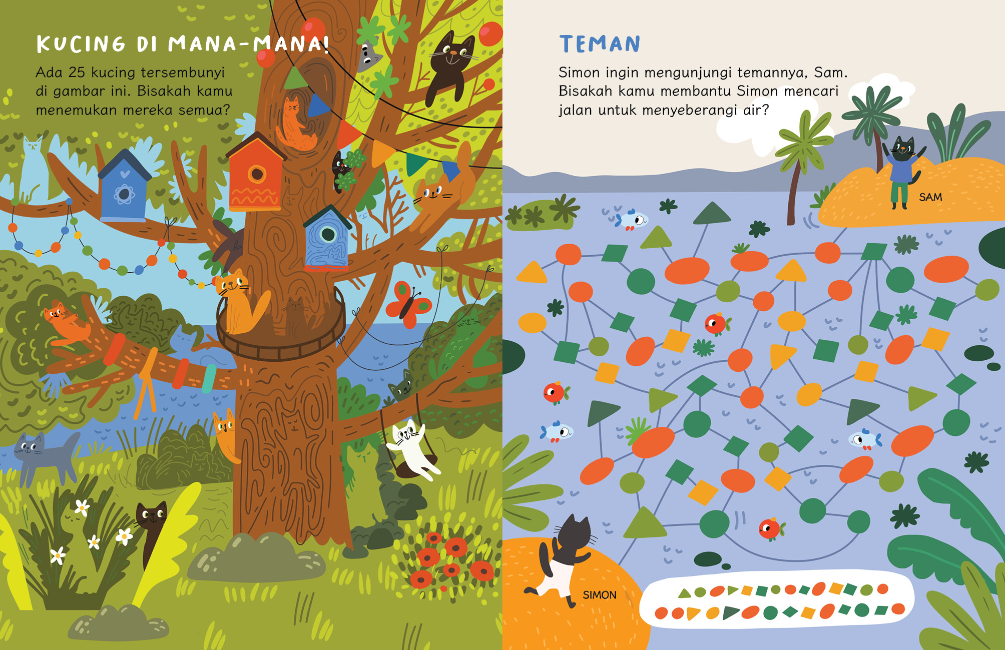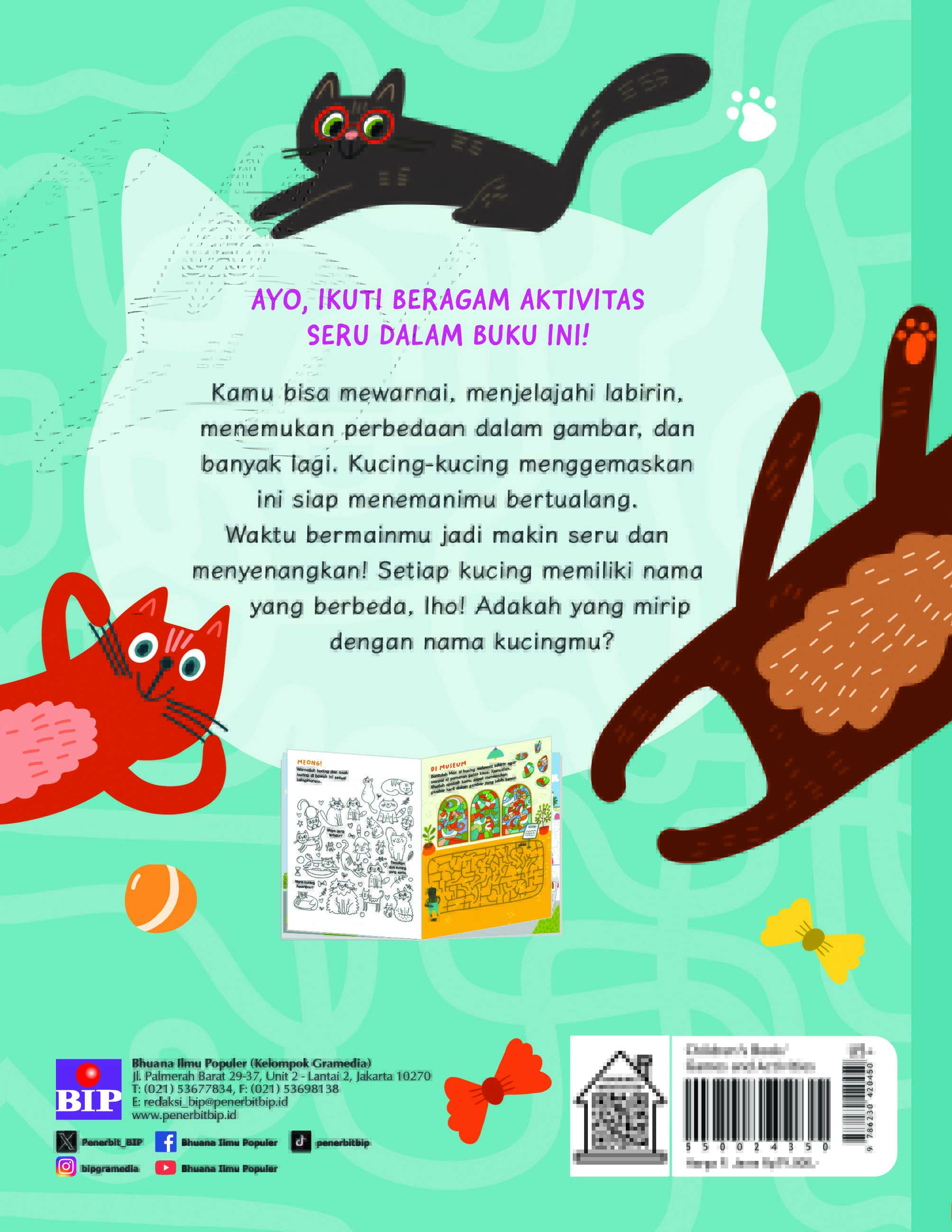 Kamu bisa mewarnai, menjelajahi labirin, menemukan perbedaan dalam gambar, dan banyak lagi. Kucing-kucing menggemaskan ini siap menemanimu bertualang. Waktu bermainmu jadi makin seru dan menyenangkan! Setiap kucing memiliki nama yang berbeda, lho! Adakah yang mirip dengan nama kucingmu?