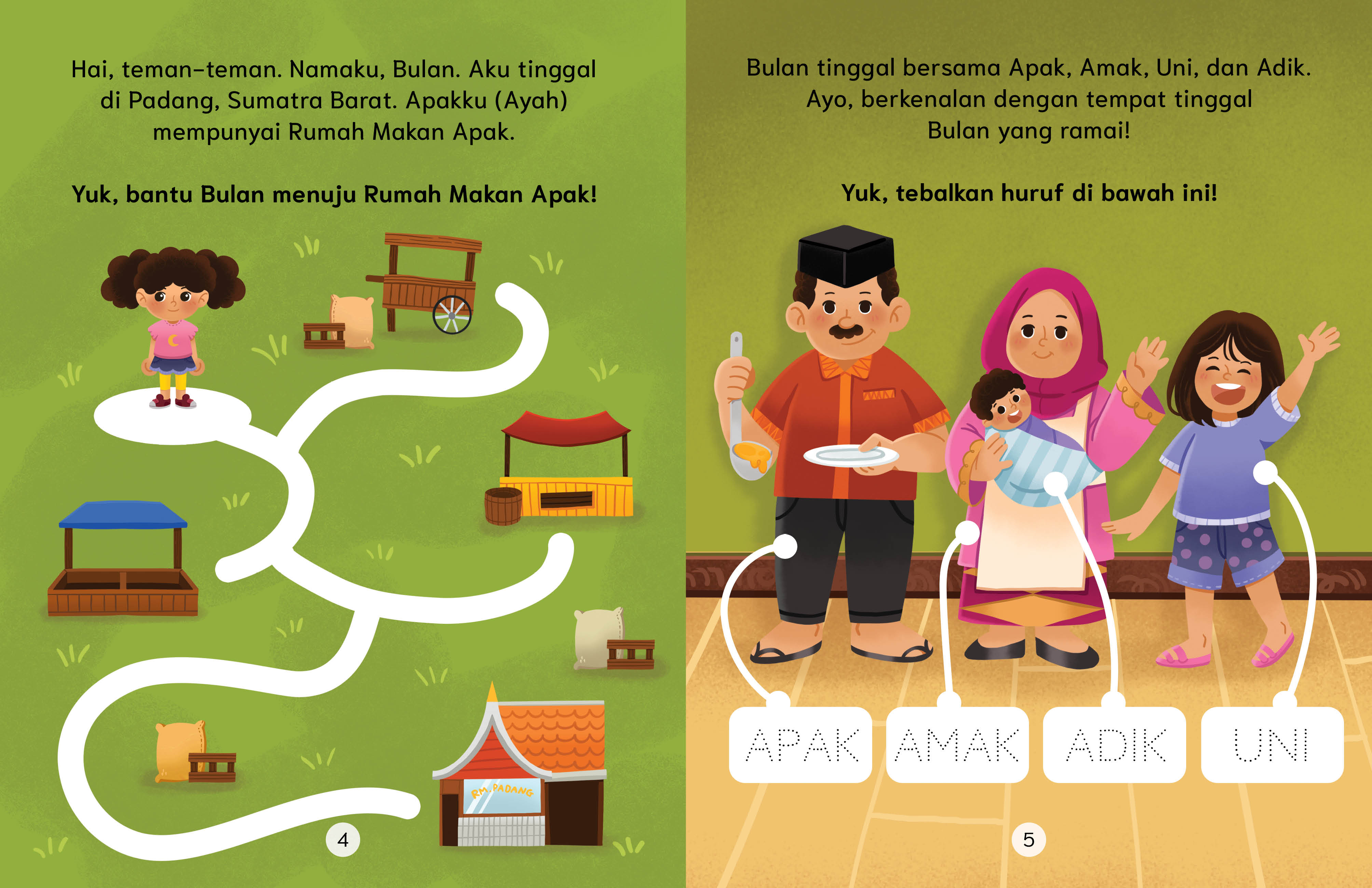 Bulan dan keluarganya berjualan nasi padang di pasar. Bulan juga sering bermain bersama anak-anak yang tinggal di pasar. Apakah kamu pernah melihat anak-anak berjualan di pasar