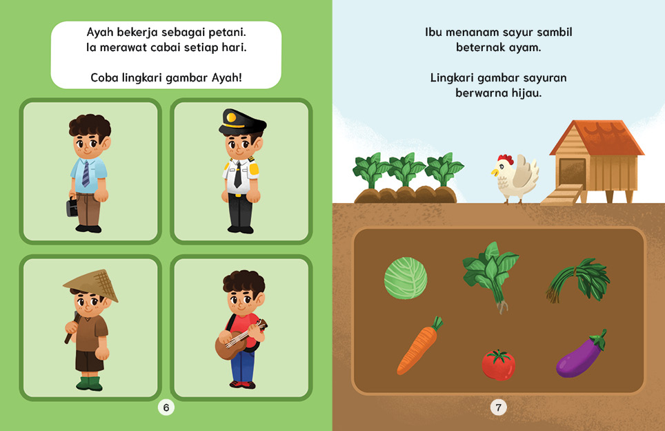 Gilang dan keluarganya sangat bahagia tinggal di kampung. Keluarga Gilang adalah petani. Di kampung, Gilang sering bersepeda bersama teman-temannya dan melihat belalang-belalang terbang. Apakah kamu pernah melihat belalang?