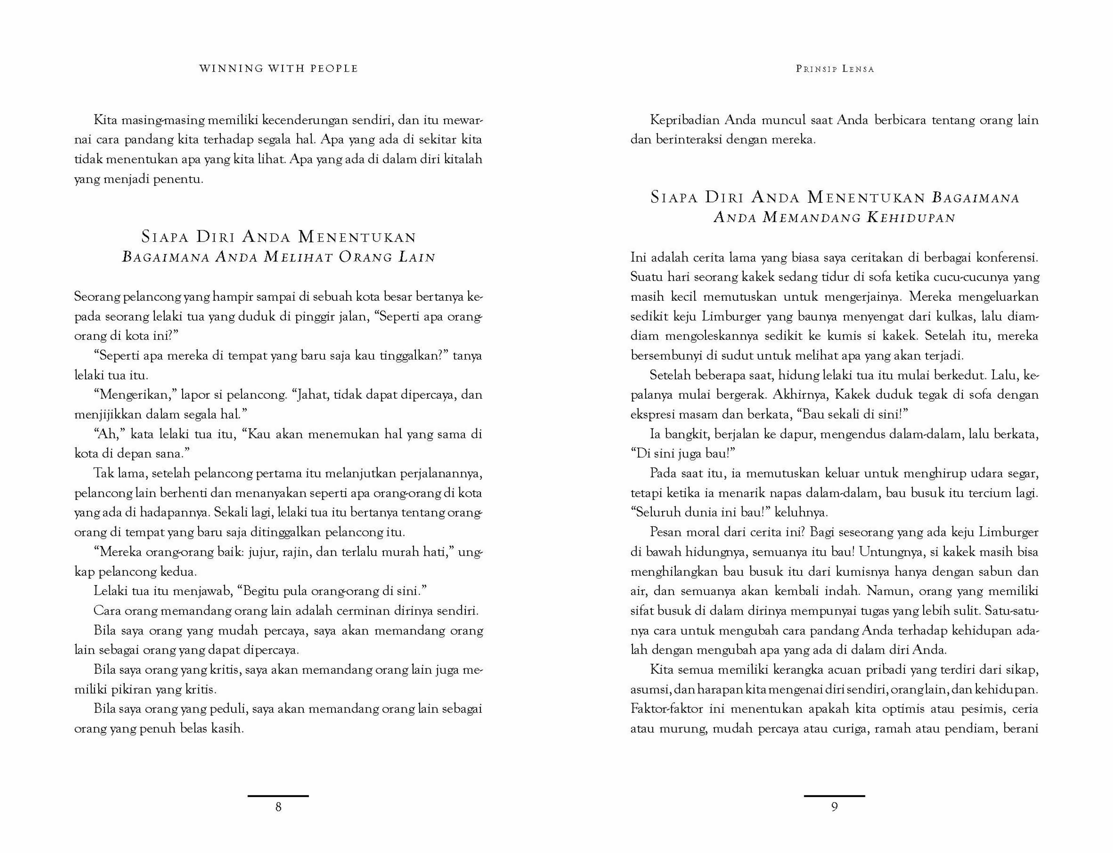 Selain itu, buku ini juga mampu menjadi panduan Anda dalam meniti karier hingga ke puncak, yang mana pasti melibatkan banyak orang, entah itu klien, bawahan, kolega, senior, maupun petinggi perusahaan. Winning with People ini adalah jembatan yang membantu Anda untuk terhubung dengan faktor eksternal terpenting dalam menjadi versi terbaik diri Anda: Orang Lain.