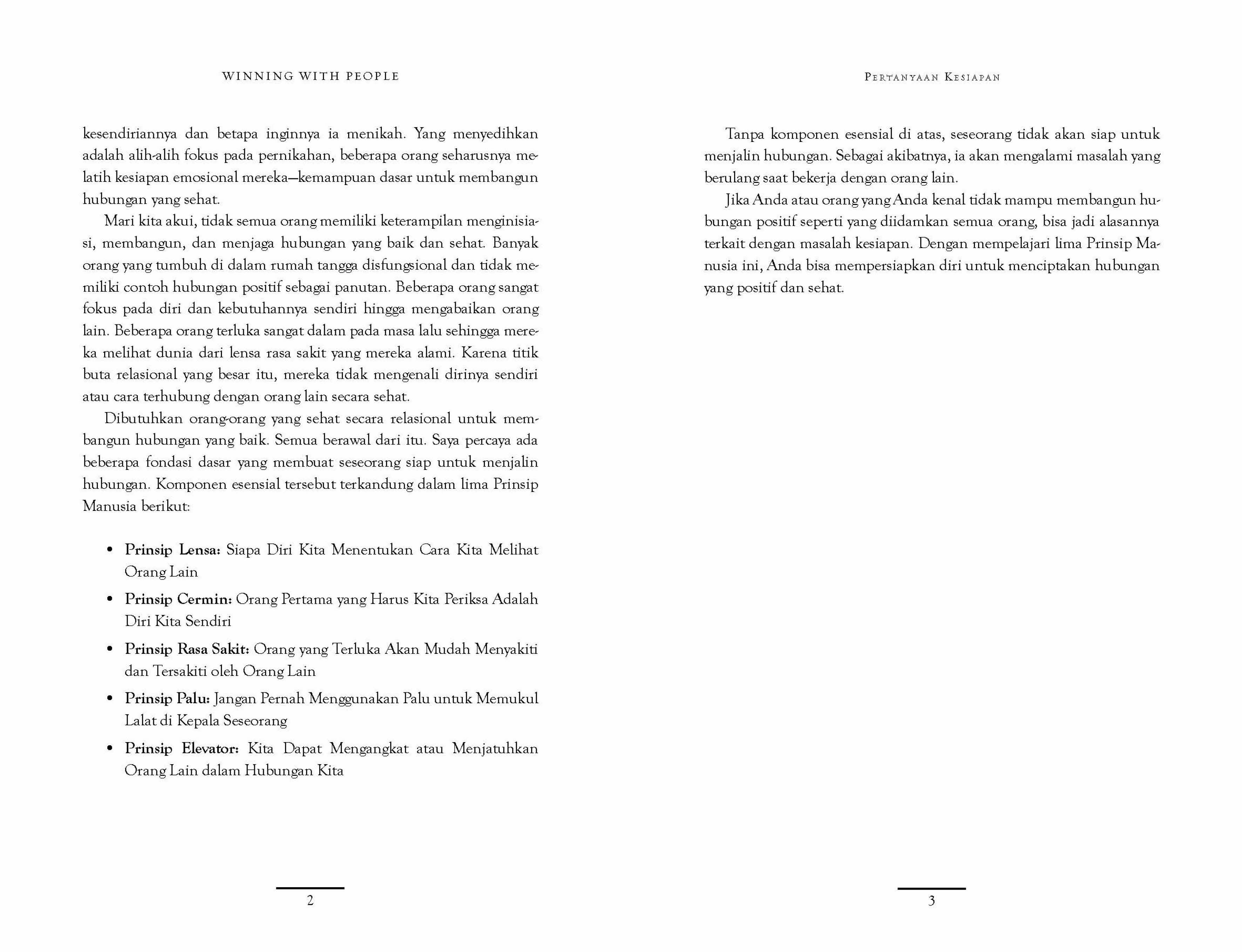 Winning with People berisikan 25 Prinsip Manusia yang mampu menuntun Anda untuk membangun hubungan yang bermakna dan berjangka pajang dengan orang-orang yang Anda butuhkan.
