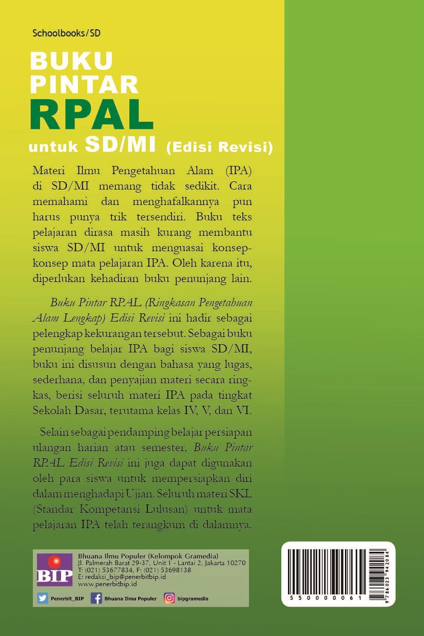 Materi IPA diSD/MI memang tidak sedikit. Cara memahami dan menghafalkannya pun harus punya trik tersendiri. Buku teks pelajaran dirasa masih kurang membantu siswa SD/MI untuk menguasai konsep-konsep mata pelajaran IPA. Oleh karena itu, diperluan kehadiran buku penunjang lain. Buku ini hadir sebagai pelengkap dalam kekurangan tersebut. Sebagai buku pnunjang belajar IPA bagi siswa SD/MI, buku ini disusun dengan bahasa yang lugas, sederhana, dan penyajian materi secara ringkas, berisi seluruh materi IPA pada tingkat SD, terutama kelas IV, V, dan VI. Selain sebagai pendamping belajar persiapan ulangan harian atau semester, BUku Pintar RPAL (edisi Revisi) ini juga dapat digunakan oleh para siswa untuk mempersiapkan diri dalam menghadapi Ujian Akhir Sekolah Berstandar Daerah (UASBD). Seluruh materi Standar Kompetensi Lulusan (SKL) untuk nata pelajaran IPA telah terangkum di dalamnya.