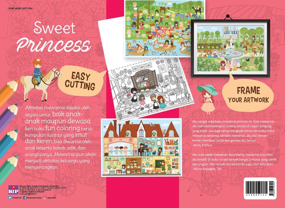 Buku mewarnai berisi 24 gambar princess yang lucu dan disukai anak-anak. Para penggemar princess pasti akan menyukai buku ini. Bidang halaman yang luas membuat kegiatan mewarnai menjadi lebih menyenangkan.
