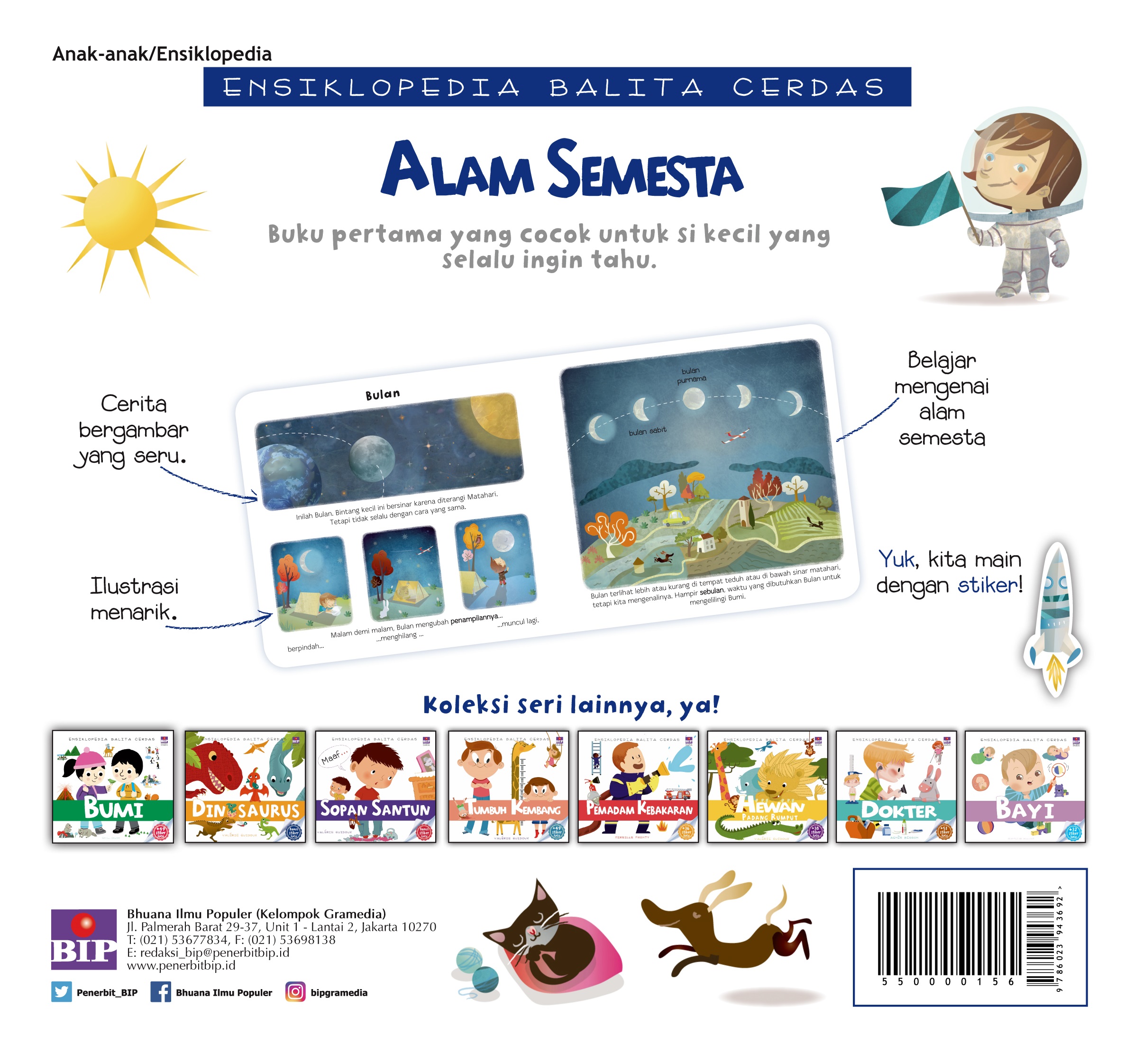 Ensiklopedia Balita Cerdas: Alam Semesta berisi berbagai isi alam semesta seperti Bumi, Bulan, bintang, dan beberapa planet. Buku ini dilengkapi dengan aktivitas-aktivitas mengasyikkan di akhir cerita, serta bonus stiker yang menarik nan lucu.