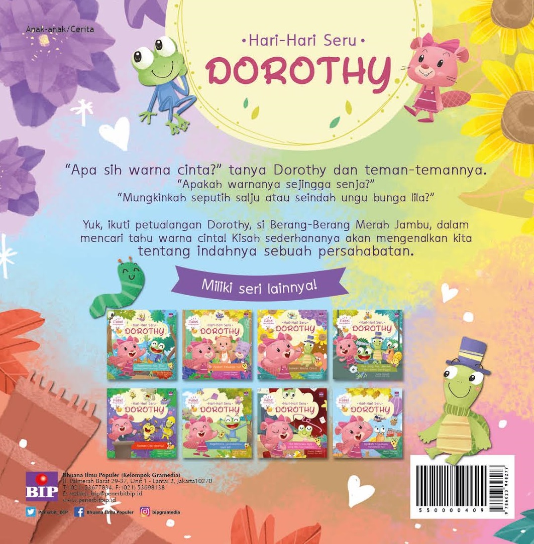 Buku ini berisi tentang keseharian Dorothy si berang-berang merah jambu bersama teman-teman hewannya. Dalam kisah di buku ini, Dorothy mencari tahu apakah warna cinta itu? Apakah warnanya seperti matahari senja yang jingga? Ataukah seputih salju? Mungkinkah seungu bunga lila? Dorothy dan teman-temannya mencoba menemukan jawabannya. Apakah Dorothy dapat mengetahui warna cinta? Yuk, ikuti petualangan Dorothy, si Berang-Berang Merah Jambu, dalam mencari arti tahu warna cinta! Kisah sederhananya akan mengenalkan kita tentang indahnya sebuah persahabatan. Hari-hari Seru Dorothy adalah seri yang terdiri atas delapan buku. Semuanya mengisahkan keseharian Dorothy.