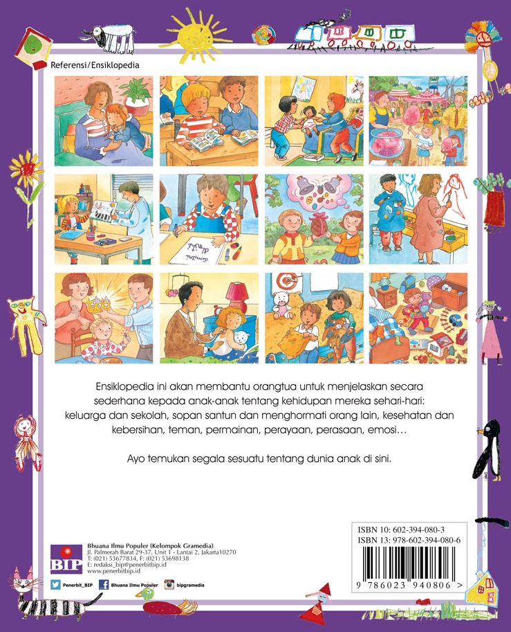 Melalui berbagai ilustrasi dan cara penyampaian yang menarik, buku ini menyajikan jawaban atas berbagai hal tentang kehidupan/ dunia anak. Misalnya: Hal-hal berbahaya apa yang tidak boleh dilakukan anak-anak saat berada di rumah? Mengapa kita harus bisa menulis? Mengapa kita harus menjaga kebersihan? Ensiklopedia ini akan membantu orangtua untuk menjelaskan secara sederhana kepada anak-anak tentang dunia mereka sehari-hari: keluarga dan sekolah, sopan santun dan menghormati orang lain, kesehatan dan kebersihan, teman, permainan, perayaan, perasaan, emosi…