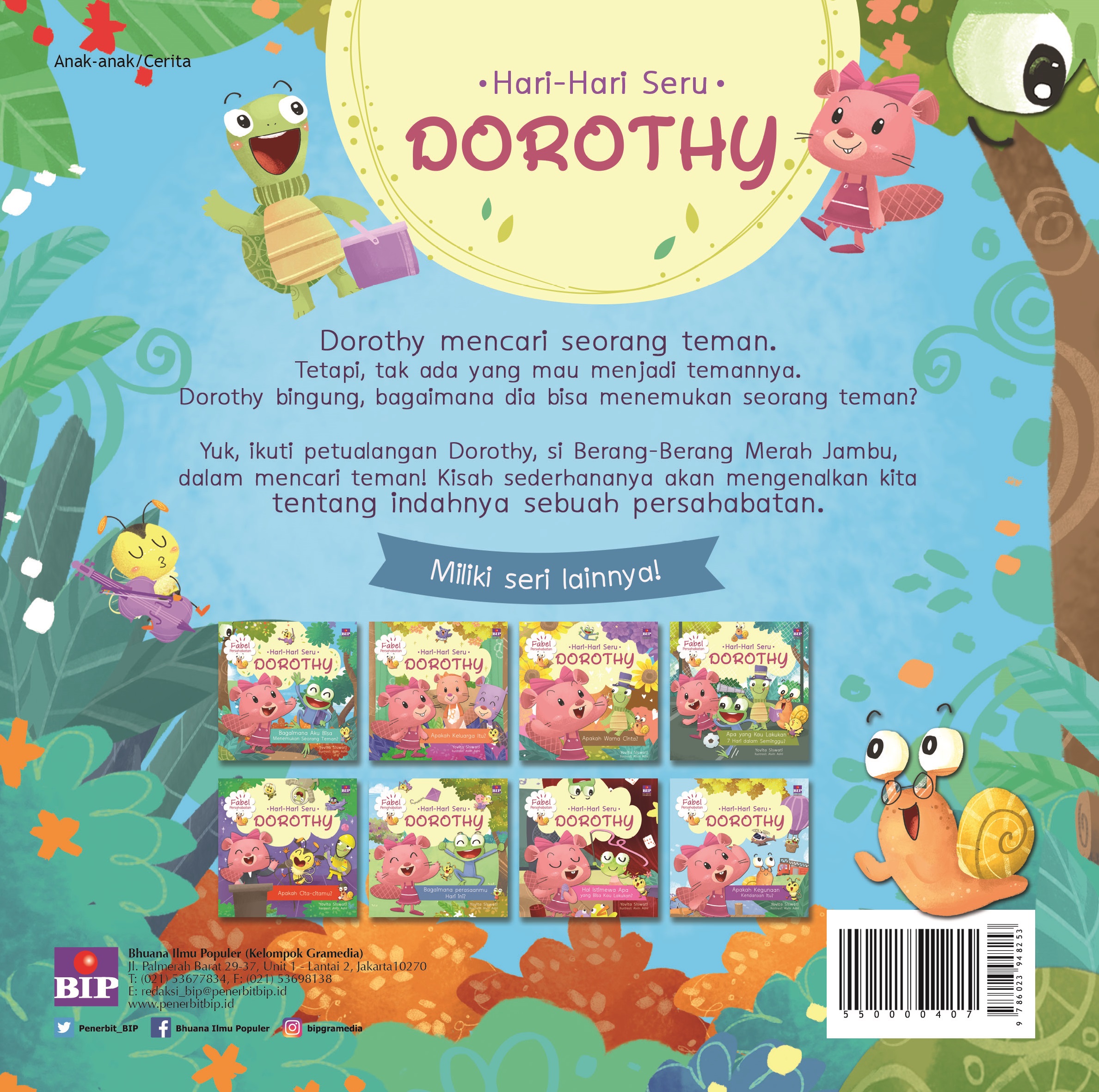 Buku ini menceritakan tentang Dorothy dan keluarganya yang baru saja pindah ke tepi telaga. Dorothy mencari seorang teman, tetapi tidak ada yang mau menjadi temannya. Mike terlalu sibuk, Nora hanya suka menyanyi, Andy terlalu aneh, sedangkan Charlie agak membosankan. Akhirnya Dorothy pun berusaha untuk bergabung dengan mereka. Yuk, ikuti petualangan Dorothy, si Berang-Berang Merah Jambu, dalam mencari teman! Kisah sederhananya akan mengenalkan kita tentang indahnya sebuah persahabatan. Hari-hari Seru Dorothy adalah seri yang terdiri atas delapan buku. Semuanya mengisahkan keseharian Dorothy.