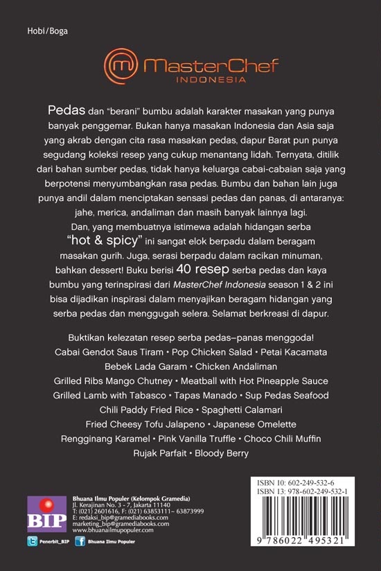 Pedas dan “berani” bumbu adalah karakter masakan yang punya banyak penggemar. Bukan hanya masakan Indonesia dan Asia saja yang akrab dengan cita rasa masakan pedas, dapur Barat pun punya segudang koleksi resep yang cukup menantang lidah. Ditilik dari bahan sumber pedas, tidak hanya keluarga cabai-cabaian saja yang berpotensi menyumbangkan rasa pedas. Bumbu dan bahan lain juga punya andil dalam menciptakan sensasi pedas dan panas, di antaranya: jahe, merica, andaliman, dan masih banyak lainnya lagi. Dan, yang membuatnya istimewa adalah hidangan serba “hot & spicy” ini sangat elok berpadu dalam beragam masakan gurih. Juga, serasi berpadu dalam racikan minuman, bahkan dessert! Buku berisi 40 resep serba pedas dan kaya bumbu yang terinspirasi dari MasterChef Indonesia season 1 & 2 ini bisa dijadikan inspirasi dalam menyajikan beragam hidangan yang serba pedas dan menggugah selera. Selamat berkreasi di dapur. Buktikan kelezatan resep serba pedas–panas menggoda! Cabai Gendot Saus Tiram • Pop Chicken Salad • Petai Kacamata • Bebek Lada Garam Spicy Chicken Broast • Chicken Andaliman • Grilled Ribs Mango Chutney Meatball with Hot Pineaple Sauce • Grilled Lamb with Tabasco • Tapas Manado Sup Pedas Seafood •Cabai Isi Panggang • Chili Paddy Fried Rice • Spaghetti Calamari Fried Cheesy Tofu Jalapeno • Japanese Omellete • Rengginang Karamel Chili Lime Cashew • Pink Vanilla Trufle • Rocky Almond Black pepper Choco Chili Muffin • Rujak Parfait • Red Hot Sorbet •Bloody Berrie