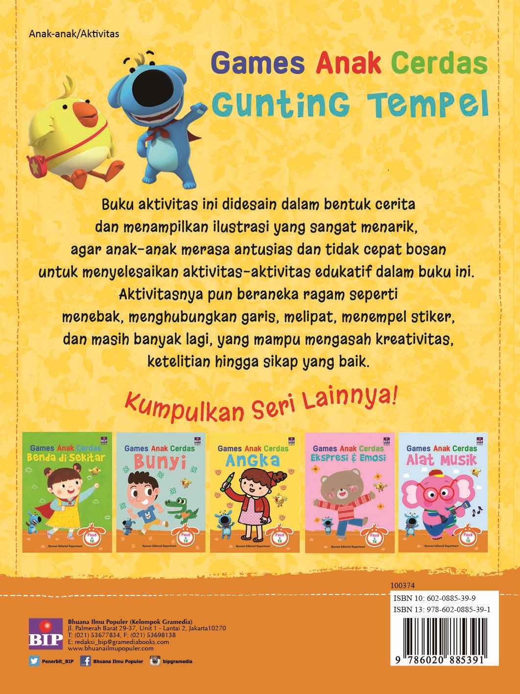 Games Anak Cerdas: Gunting Tempel merupakan buku aktivitas permainan yang sangat menarik dan unik. Buku ini berfokus pada aktivitas gunting tempel yang mengasah kreativitas, sensor motorik halus, dan melatih daya fokus anak.