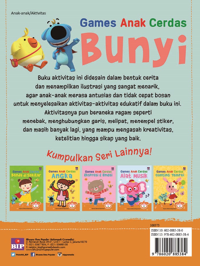 Games Anak Cerdas: Bunyi merupakan buku aktivitas yang sangat menarik serta memberikan aktivitas yang beragam dan unik. Buku aktivitas ini menjelaskan kepada anak-anak mengenai bunyi-bunyian, misalnya bunyi benda di sekitar, suara hewan, dan sebagainya.