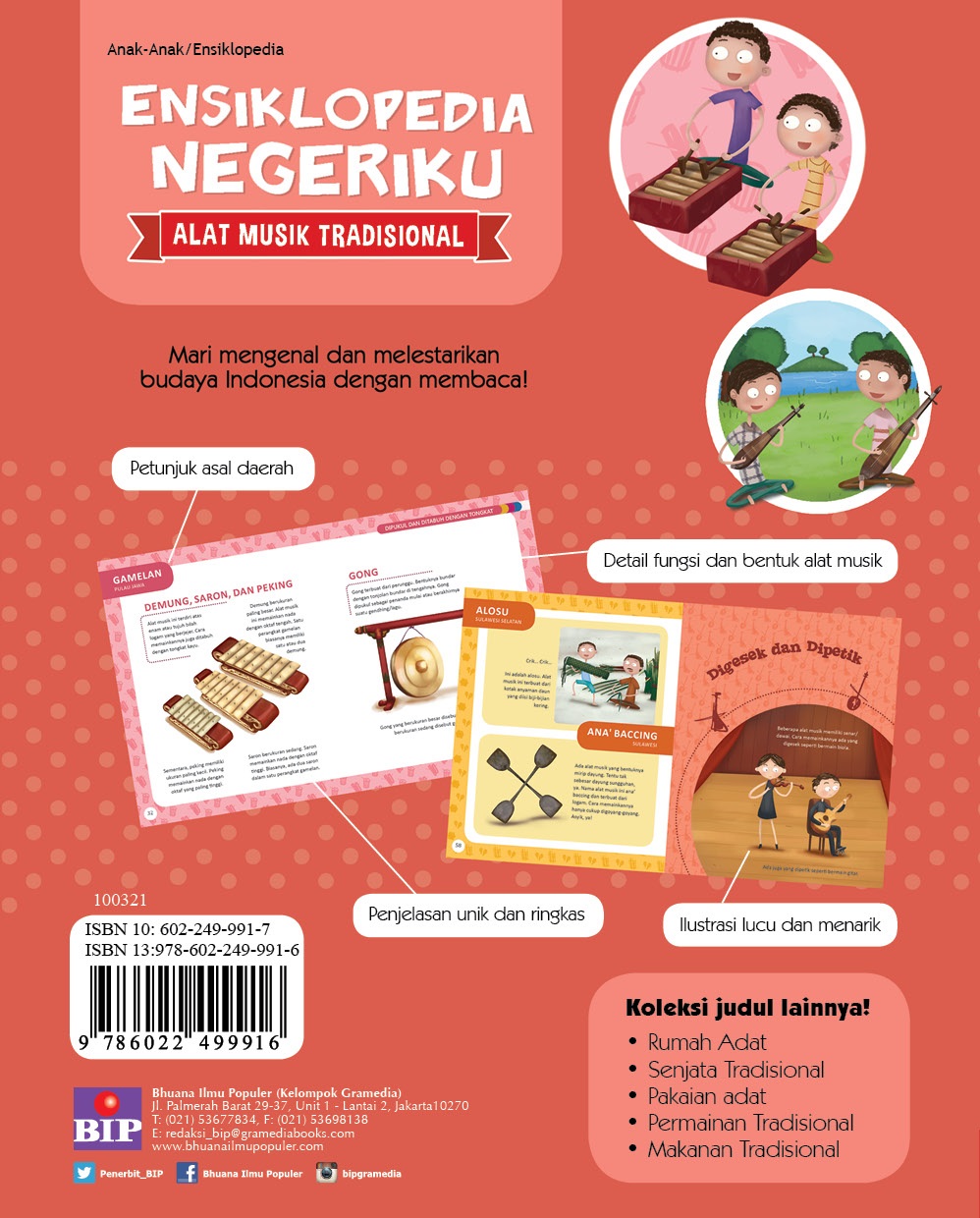 Buku ini berisikan alat musik tradisional yang dikenal di Indonesia sejak zaman dahulu. Beberapa alat musik tradisional yang tercantum di buku ini mungkin sudah tidak dimainkan/dikenal lagi oleh masyarakat Indonesia, misal calung rantay. Buku ini berusaha mengenalkan kekayaan budaya Indonesia—yaitu alat musik tradisional—kepada anak-anak Indonesia agar tetap lestari. Buku ini merupakan salah satu dari enam seri Ensiklopedia Negeriku (Permainan Tradisional, Senjata Tradisional, Rumah Adat, Pakaian Adat, Makanan Tradisional, Alat Musik Tradisional)