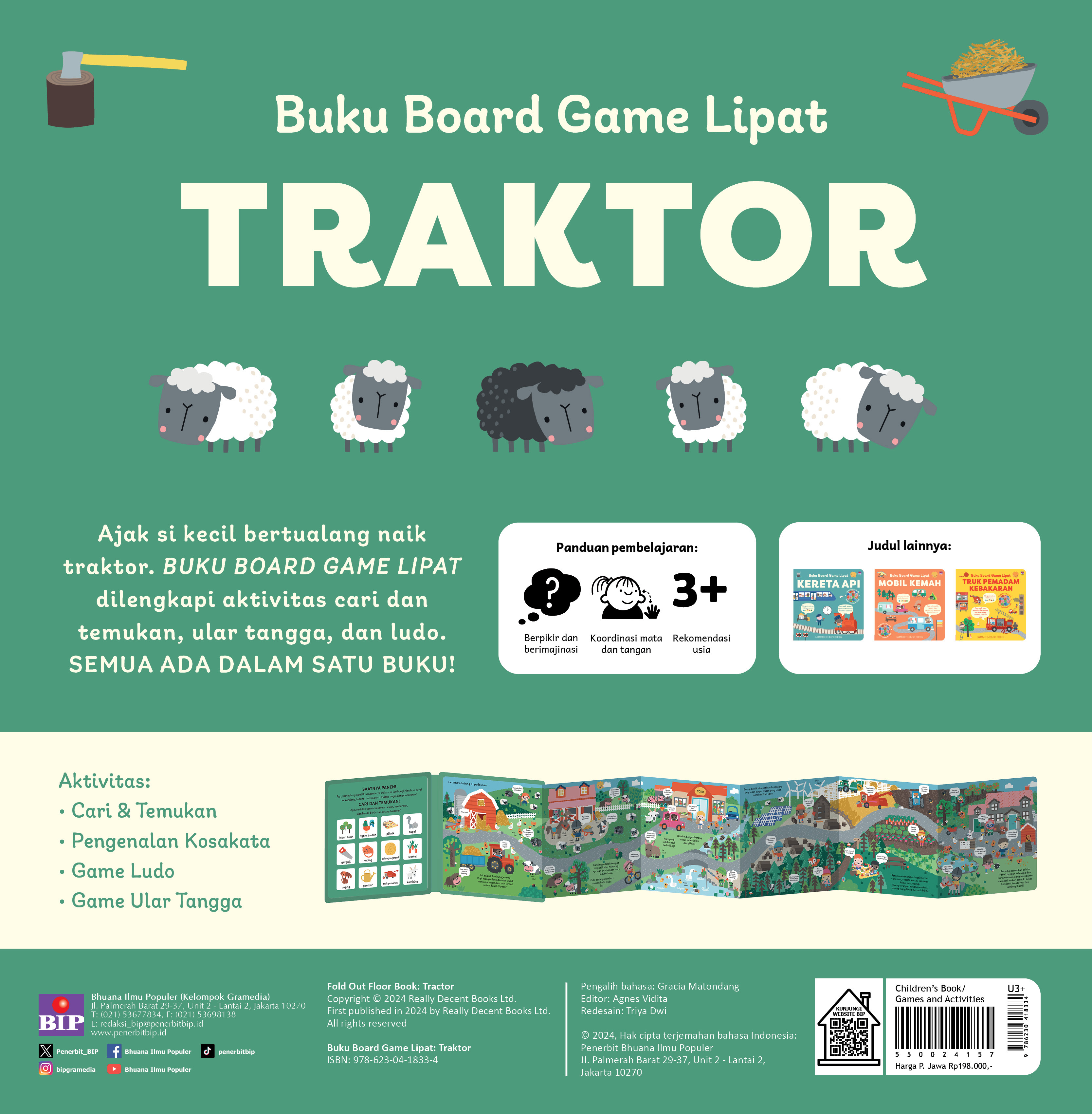 Ajak si kecil bertualang naik traktor. BUKU BOARD GAME LIPAT dilengkapi aktivitas cari dan temukan, ular tangga, dan ludo. SEMUA ADA DALAM SATU BUKU!