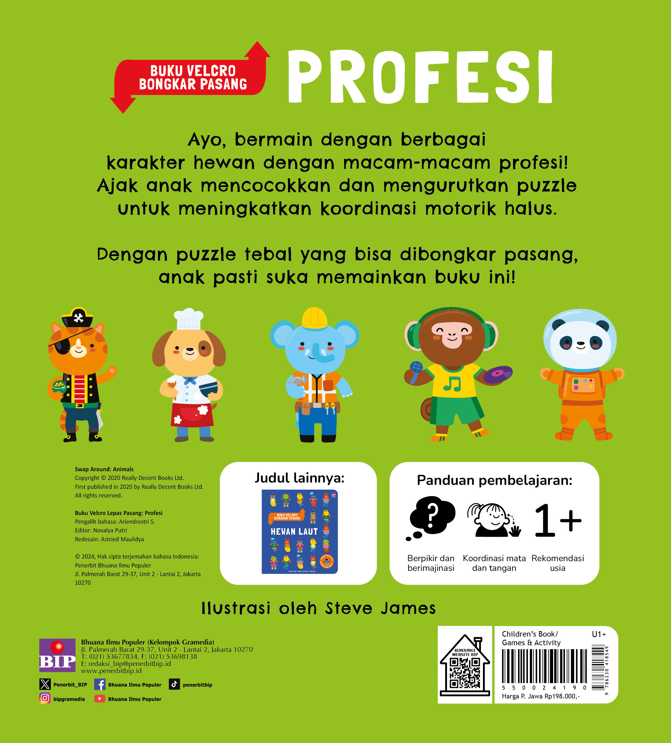 Ayo, bermain dengan berbagai karakter hewan dengan macam-macam profesi! Ajak anak mencocokkan dan mengurutkan puzzle untuk meningkatkan koordinasi motorik halus.