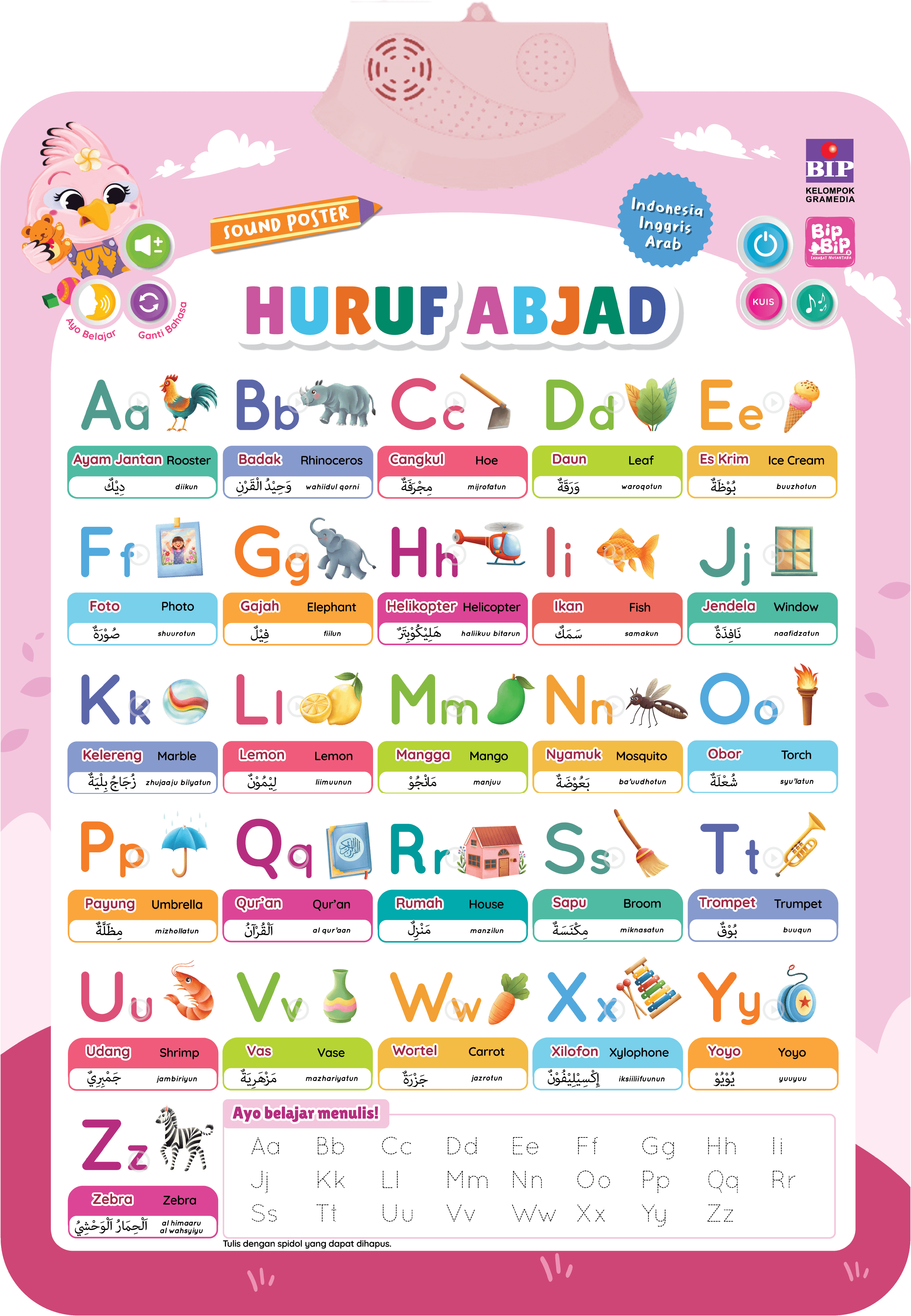 Yuk, lihat dan dengarkan huruf abjad A sampai Z dan benda di sekitar dari huruf depannya bersama Sound Poster Bip-Bip dan Sahabat Nusantara! Ditemani karakter-karakter hewan lucu khas Indonesia, anak dapat belajar memperkaya kosakata dalam tiga bahasa sekaligus, yakni Indonesia, Inggris, dan Arab. Terdapat juga aktivitas dan kuis sebagai latihan yang menyenangkan setelah bereksplorasi.