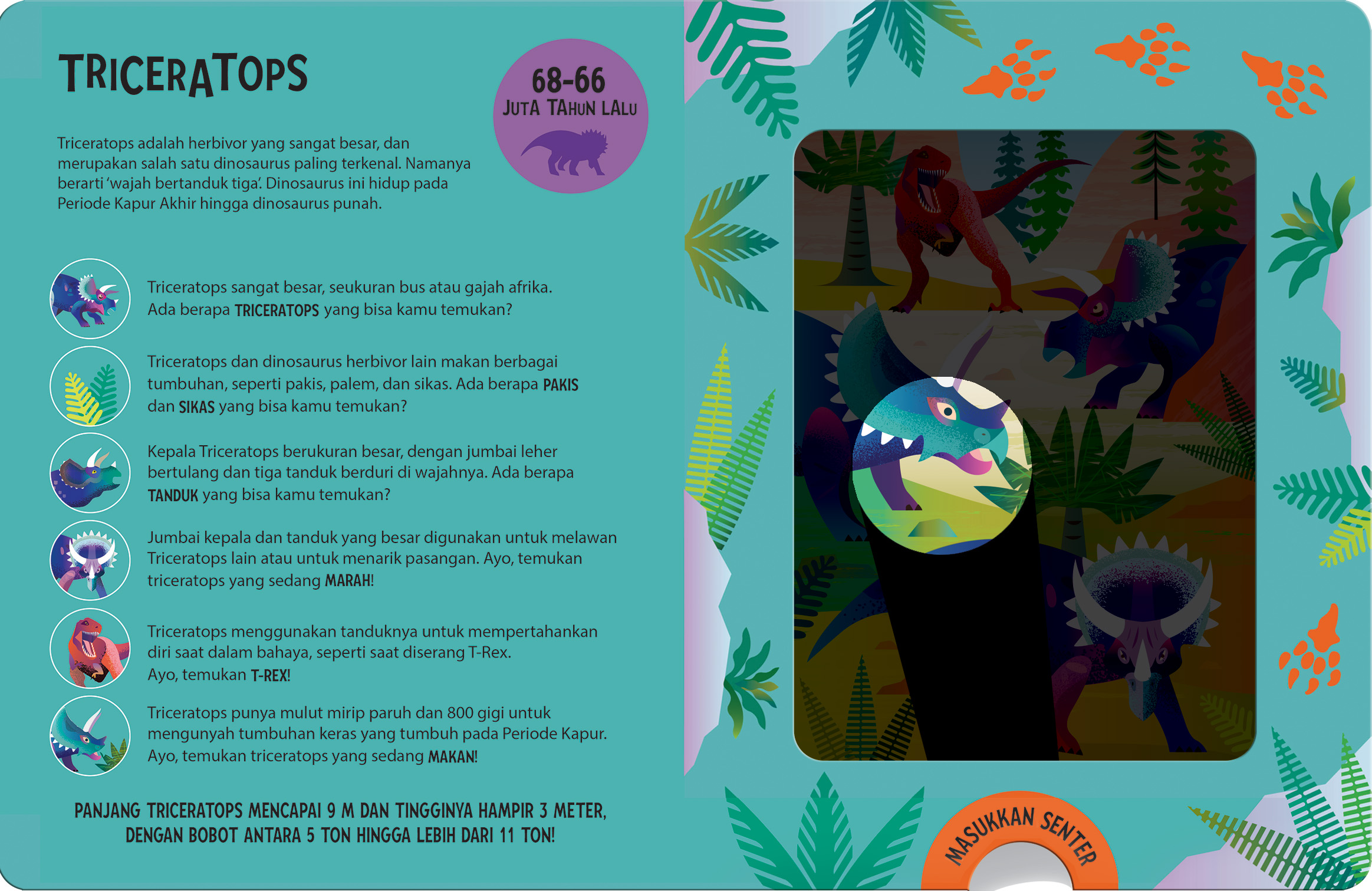 Buka halaman berjendela dan gunakan senter ajaib untuk mencari dinosaurus yang menakjubkan.