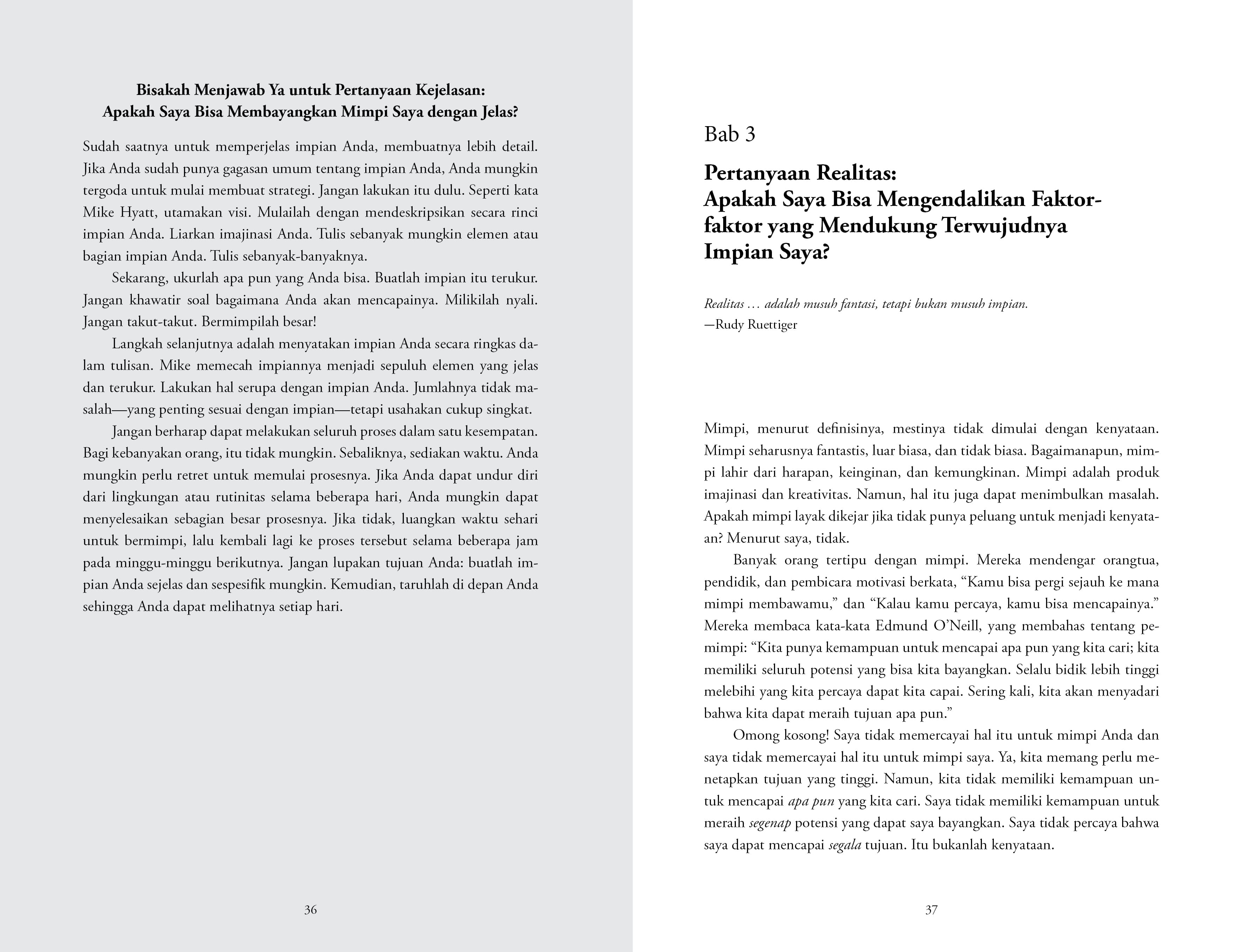 Mereka tidak tahu bagaimana cara meraih mimpi. Mereka hanya punya gagasan yang samar-samar bahwa kelak mereka akan melakukan sesuatu atau mereka hanya bisa berangan-angan suatu hari nanti, mereka akan menjadi sosok yang mereka impikan. Namun, mereka tidak tahu bagaimana cara mencapainya. Jika hal ini menggambarkan Anda, Anda boleh merasa senang bahwa benar-benar masih ada harapan untuk Anda. Ini karena saya yakin bahwa buku ini dapat membantu Anda.