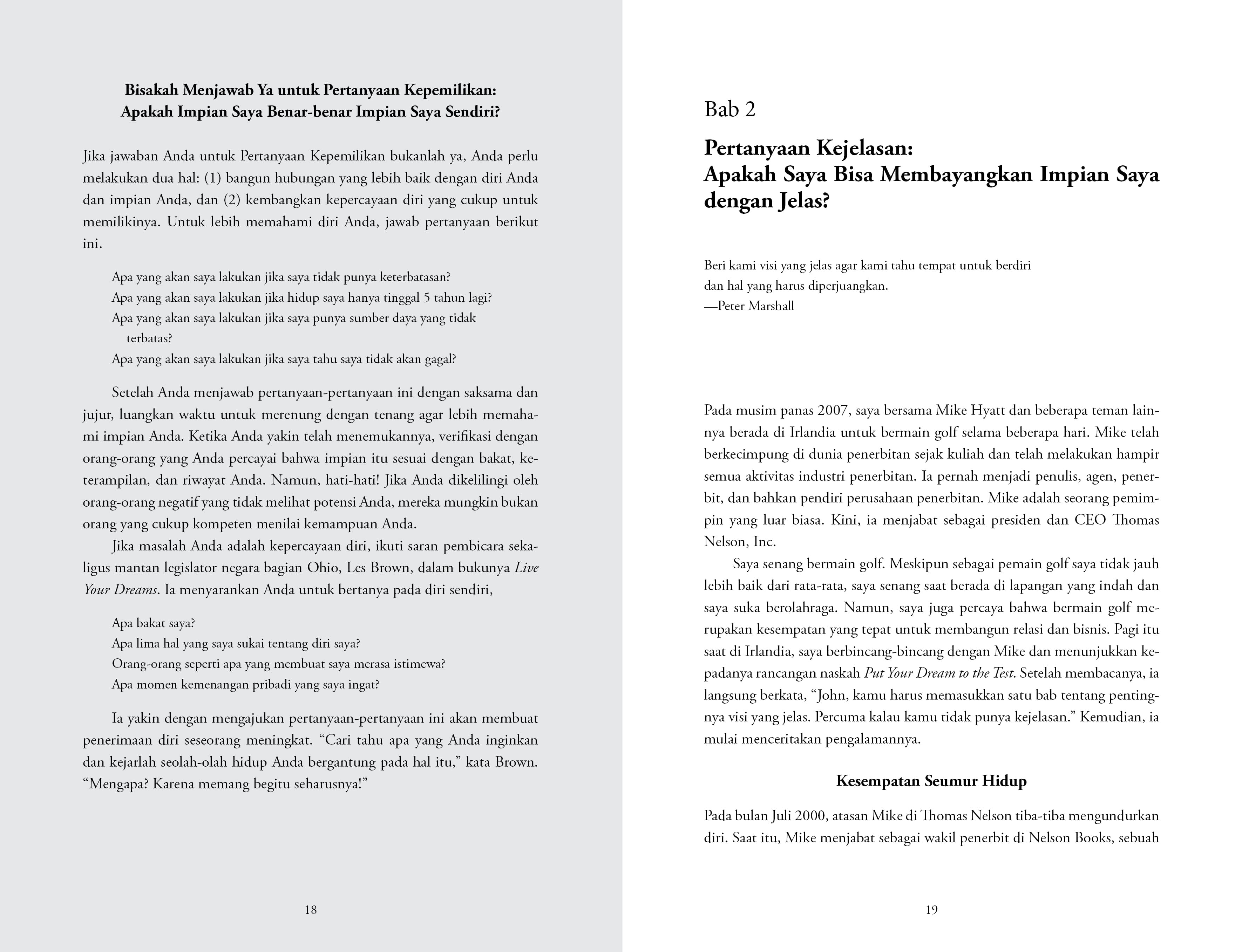 Apa impian Anda? Apakah impian itu akan tercapai? Saya yakin Anda menginginkannya. Saya yakin Anda berharap akan mencapainya. Namun, apakah Anda benar-benar akan mewujudkannya? Kalau Anda bisa menilai, berapa besar peluangnya? Satu dari lima? Satu dari seratus? Satu dari sejuta? Bagaimana Anda bisa tahu apakah Anda punya peluang yang bagus atau apakah impian Anda akan tetap begitu saja—hanya sekadar impian? Lalu, apakah Anda bersedia untuk mengujinya?