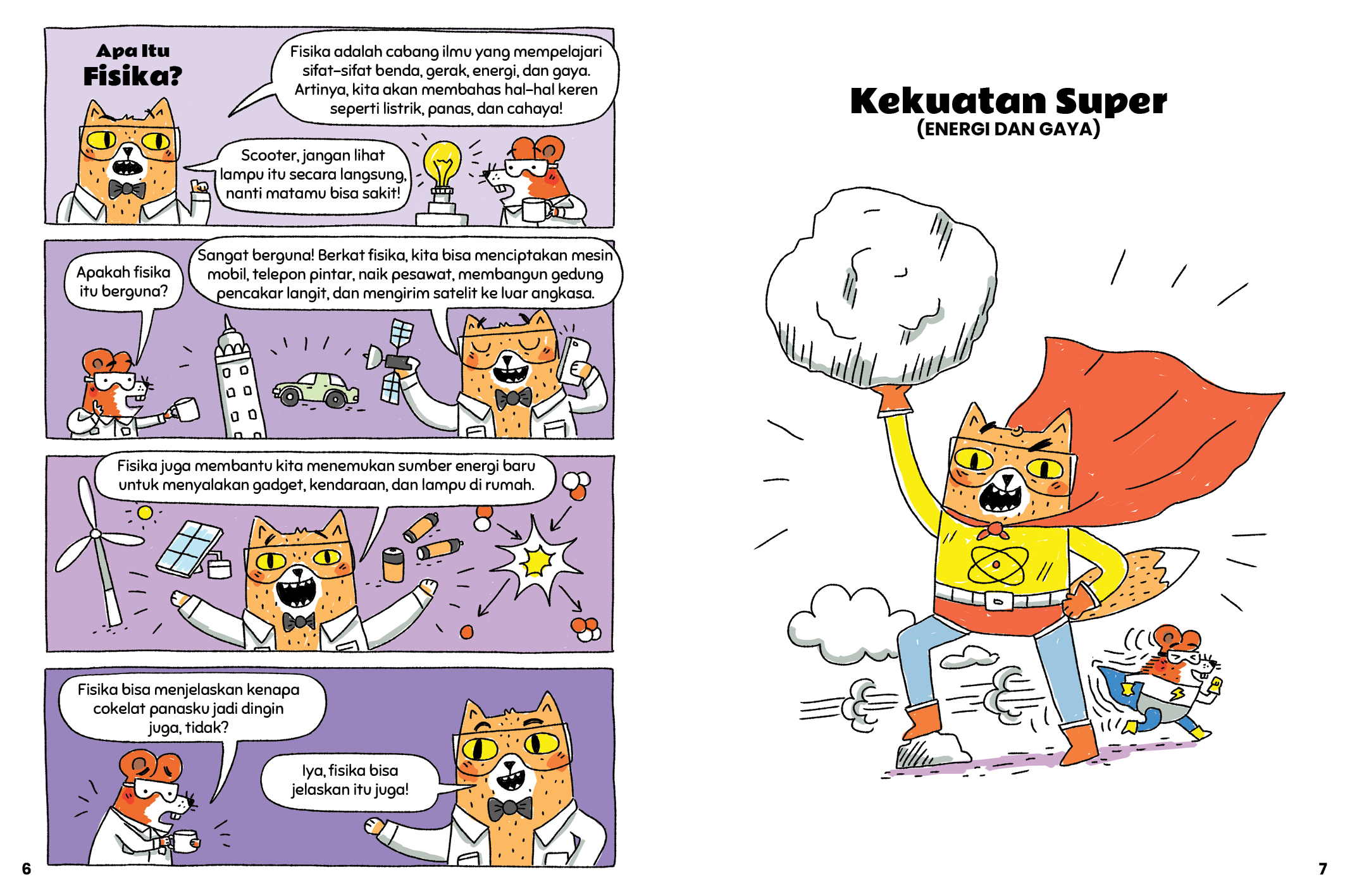Bersiaplah menjelajahi dunia sains bersama Profesor Katzenstein dan asistennya, Scooter! Terdapat komik lucu dan eksperimen yang penuh kejutan, mulai dari cara bergerak secepat kilat, menjelajahi lorong waktu, hingga cara melayang di udara. Temukan sisi lain serta serunya memahami energi dan gelombang alam semesta!