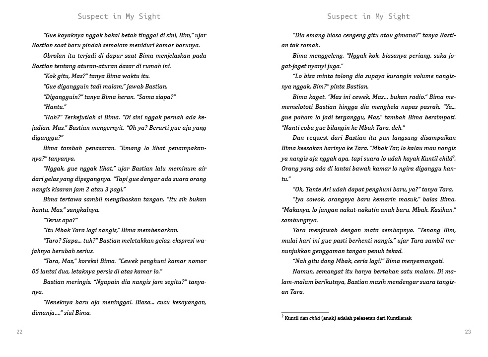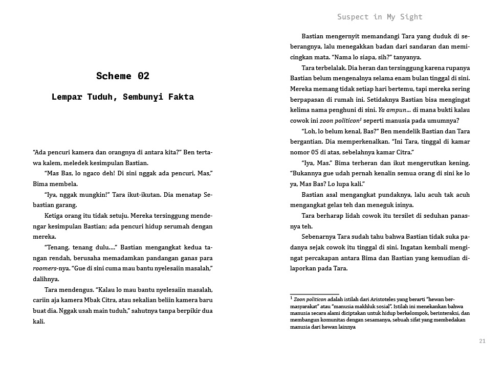 Peran detektif gadungan pun Tara lakoni. Sepulang kerja atau hari libur, Tara menginterogasi penghuni rumah satu per satu. Ia menemukan kejanggalan dari alibi Bima. Bukan cuma itu, sikap aneh Citra, pemilik kamera yang hilang juga mencurigakan. Di samping itu, tingkah Ben yang diam-diam menghasut Citra mengenai Tara tak kalah mengherankan. Tara makin termotivasi mencari dalang pencurian kamera Citra untuk membuktikan dirinya tak bersalah. Belakangan Tara juga membaca novel misteri. Penulis novel misteri dan thriller yang ia suka baru-baru ini adalah Ezra Ramiro. Ezra ialah penulis asal Indonesia misterius yang tak diketahui identitasnya.