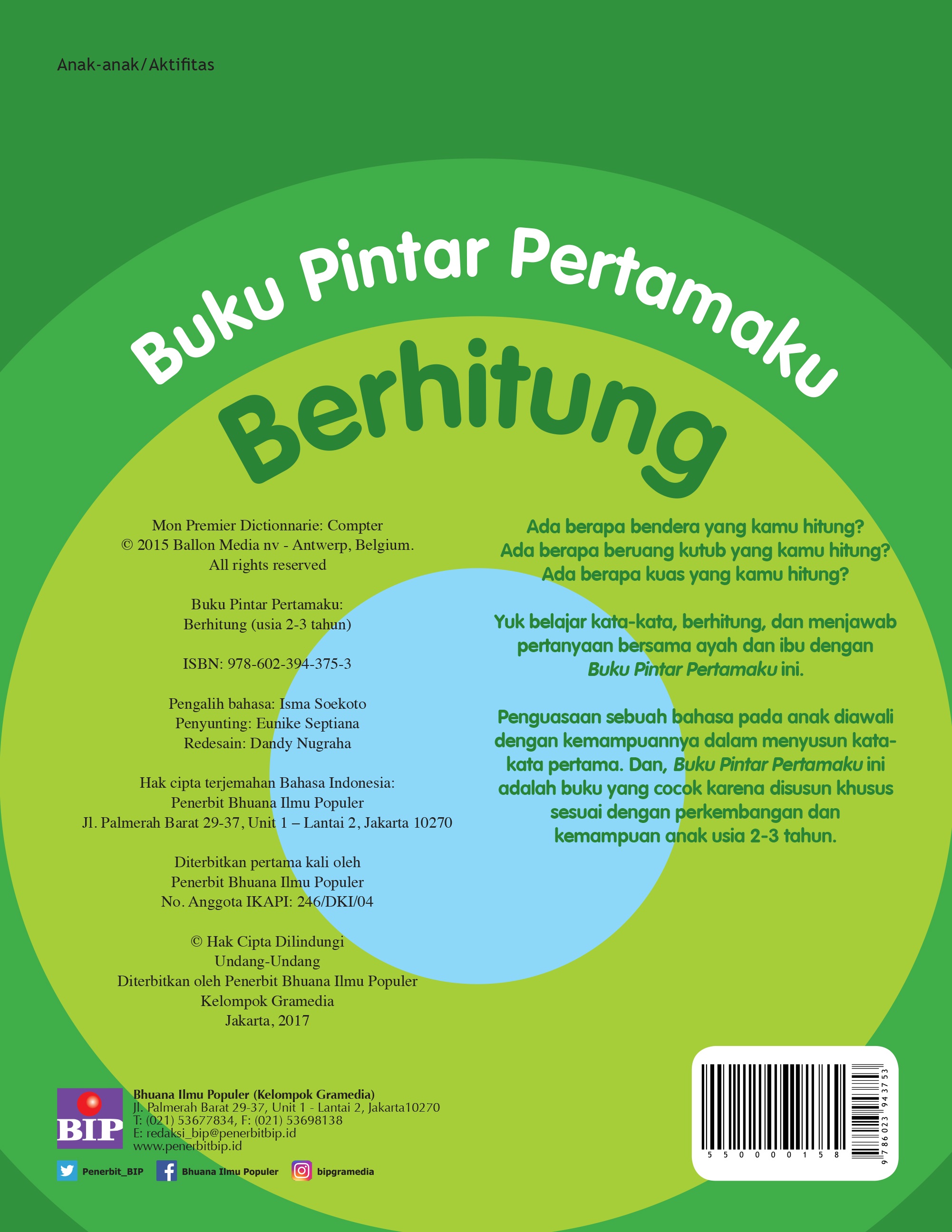 Penguasaan sebuah bahasa pada anak diawali dengan kemampuannya dalam menyusun kata-kata pertama. Dan, buku ini memberikan apa yang dibutuhkan anak-anak usia 2-3 tahun dalam perkembangannya untuk menguasai bahasa. Buku Pintar Pertamaku: Berhitung (Usia 2-3 tahun) ini adalah buku untuk belajar kosakata dasar dan berhitung 1-10 yang disusun khusus sesuai dengan perkembangan dan kemampuan anak usia 2-3 tahun.