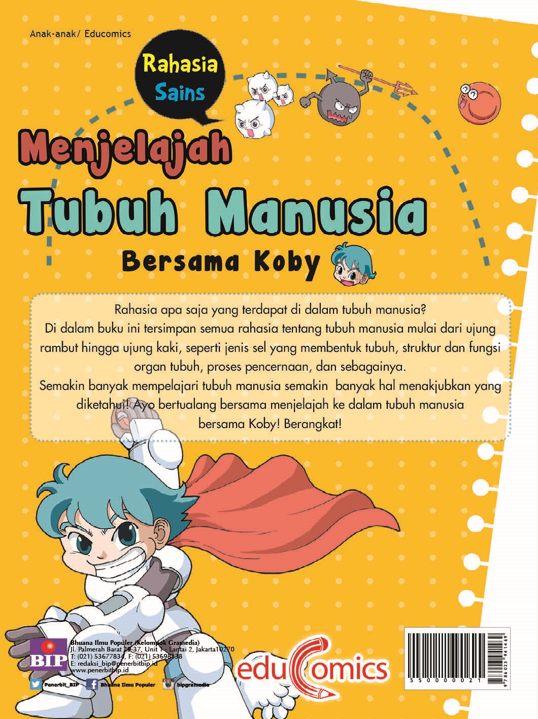 Di dalam buku ini, tersimpan semua rahasia tentang tubuh manusia mulai dari ujung rambut hingga ujung kaki, seperti jenis sel yang membentuk tubuh, struktur dan fungsi organ tubuh, proses pencernaan, dan lain sebagainya. Semakin banyak mempelajari tubuh manusia semakin banyak hal menakjubkan yang diketahui! Ikuti petualangan menjelajahi tubuh manusia bersama Koby.