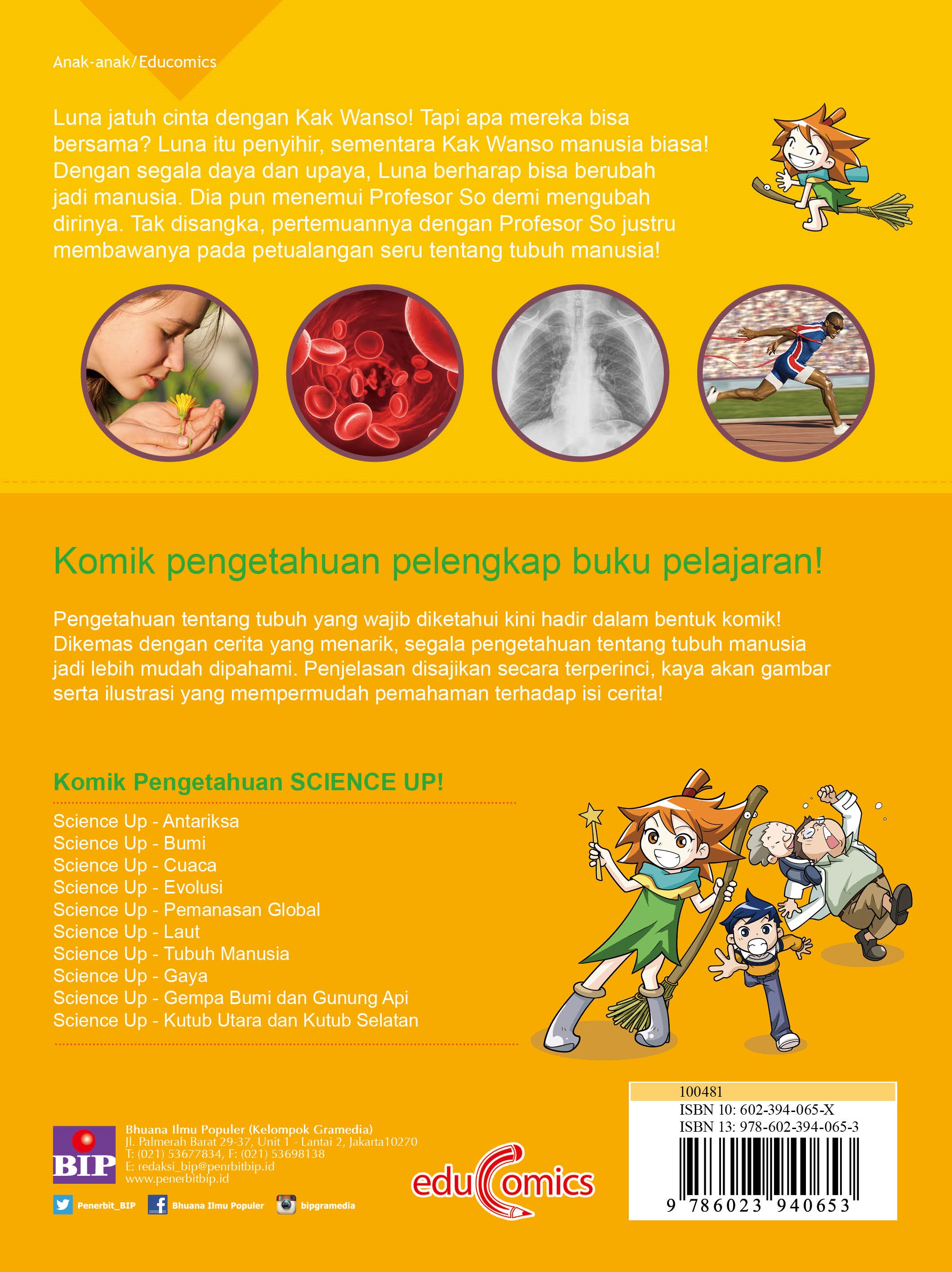 Luna jatuh cinta dengan Kak Wanso! Tapi apa mereka bisa bersama? Luna itu penyihir, sementara Kak Wanso adalah manusia biasa! Dengan segala daya dan upaya, Luna pun berharap bisa berubah menjadi manusia. Dia pun menemui Profesor So demi mengubah dirinya menjadi manusia. Tak disangka, pertemuannya dengan Profesor So justru membawanya pada petualangan seru tentang tubuh manusia! Pengetahuan tentang tubuh manusia dikemas dalam bentuk komik. Dengan cerita yang menarik, segala pengetahuan tentang tubuh manusia jadi lebih mudah dipahami. Penjelasan disajikan secara terperinci, kaya akan gambar serta ilustrasi yang mempermudah pemahaman terhadap isi cerita.