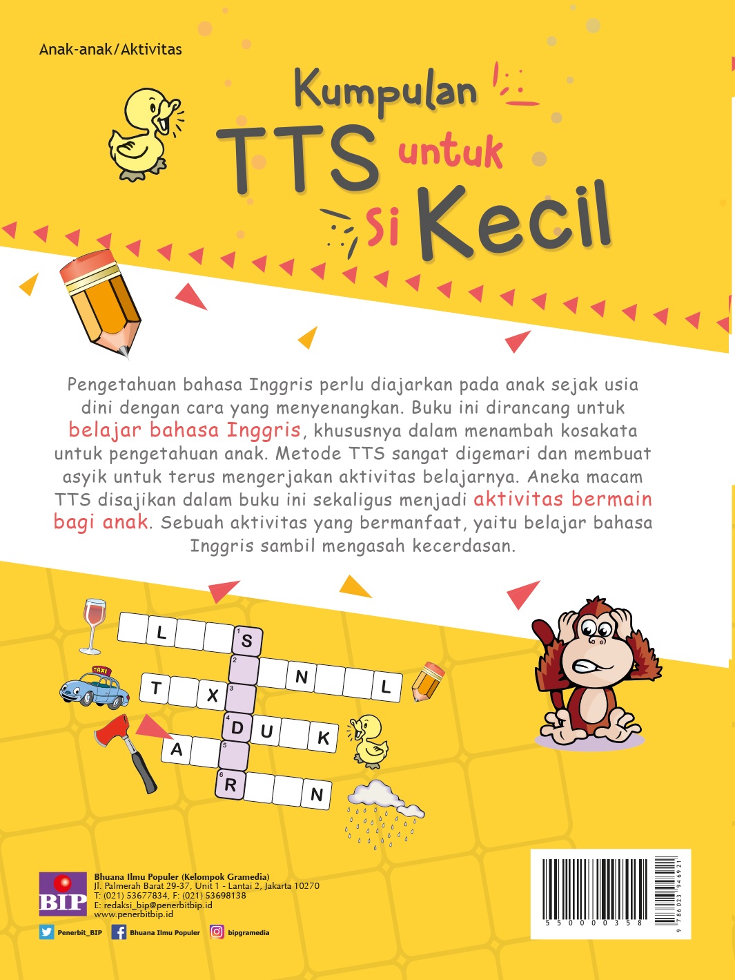 Buku ini ditulis untuk belajar bahasa Inggris, khususnya dalam menambah kosakata untuk pengetahuan anak. Metode TTS sangat digemari dan membuat asyik untuk terus mengerjakan aktivitas belajarnya dengan permainan menemukan kata yang tersembunyi.