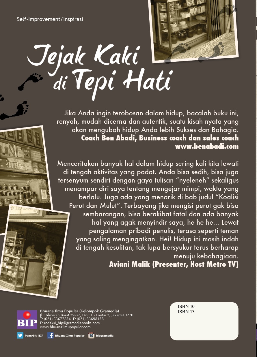 Jejak Kaki di Tepi Hati akan menuntun Anda menemukan hal-hal yang hebat, luar biasa, atau kiat-kiat bagaimana bisa sukses dan pensiun semuda mungkin. Buku ini sangat inspiratif, lugas, sederhana, mudah dicerna dan mengubah pikiran kita ketika membacanya. Dari hal yang tak pernah terpikirkan kita atau kita sadari. Jika Anda ingin terobosan dalam hidup, bacalah buku ini, renyah, mudah dicerna dan autentik, suatu kisah nyata yang akan mengubah hidup Anda lebih Sukses dan Bahagia.
