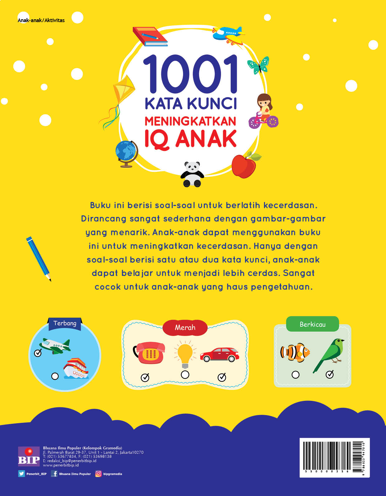 Buku ini berisi soal-soal untuk berlatih kecerdasan. Disusun sangat sederhana dengan gambar-gambar yang menarik. Anak-anak dapat menggunakan buku ini untuk meningkatkan kecerdasan. Hanya dengan soal-soal berisi satu atau dua kata kunci, anak-anak dapat belajar untuk menjadi lebih cerdas.