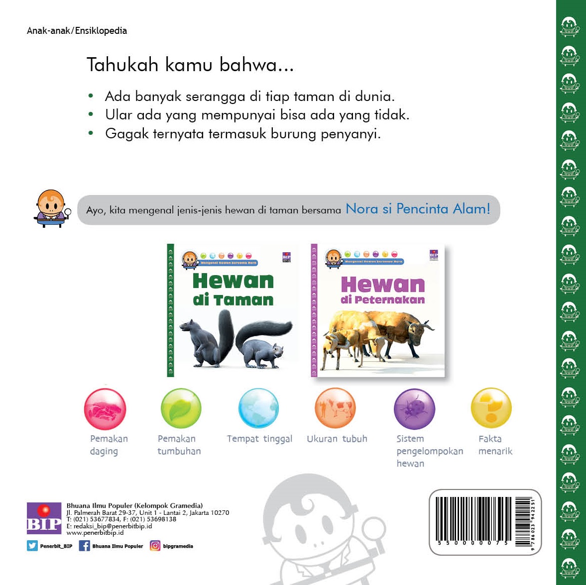 Nora akan mengajak anak-anak untuk mempelajari fakta menarik tentang hewan yang ada di taman, mulai dari serangga, burung, rubah, dan lainnya. Buku ini membantu orangtua untuk menjelaskan secara sederhana dan menyenangkan kepada anak-anak tentang hewan-hewan tersebut dengan disertai dengan foto-foto.