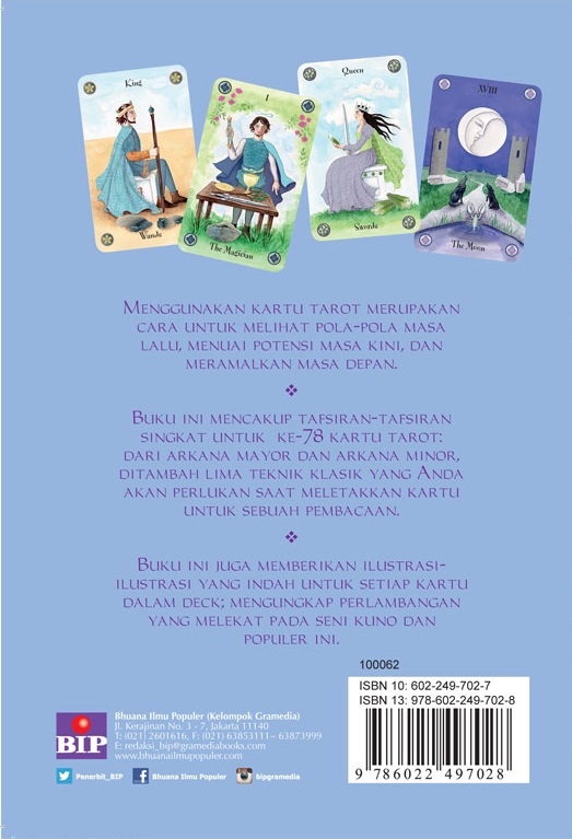 Boks berisi buku petunjuk praktis penggunaan tarot serta tafsiran singkat masing-masing tarot, mulai dari arkarna mayor dan arkarna minor, dan satu set kartu tarot (78 kartu).