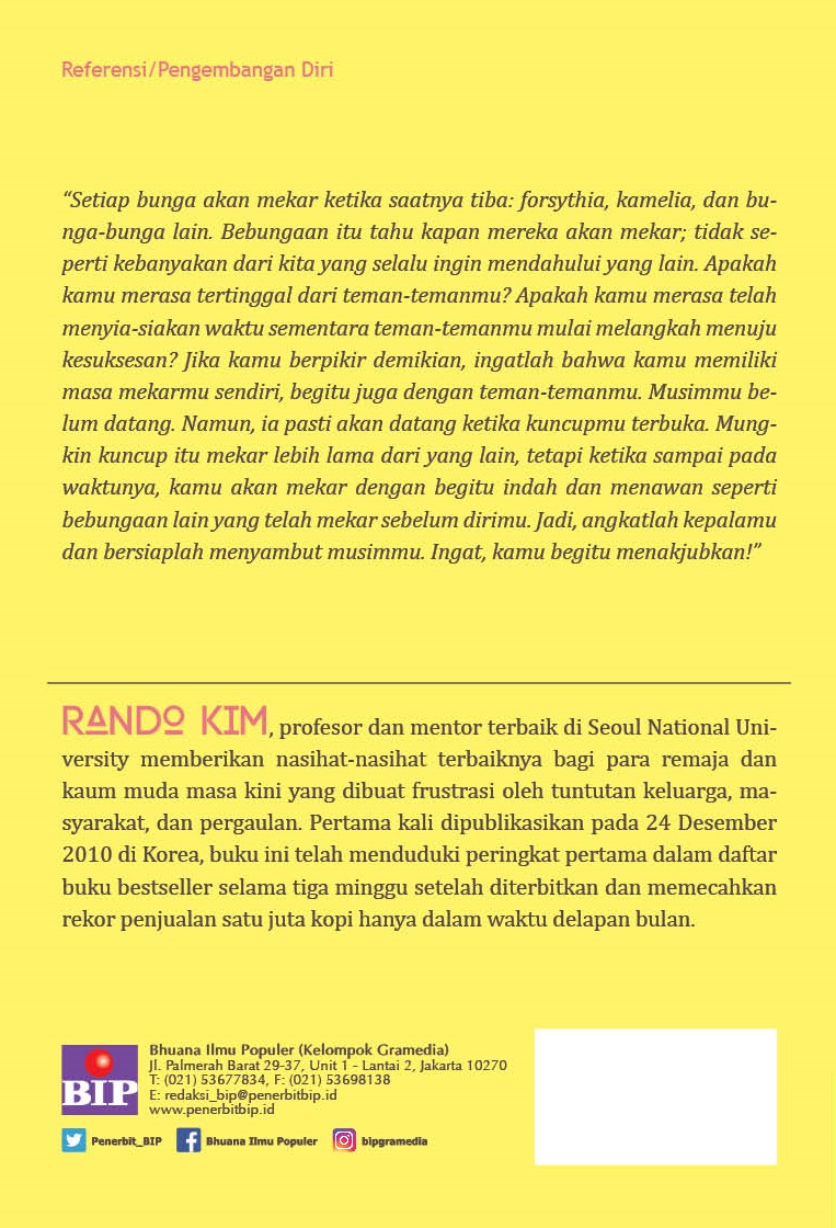 Buku ini berisi tentang motivasi untuk anak-anak muda yang merasa dirinya belum melakukan sesuatu yang luar biasa. Penulis mengingatkan bahwa setiap orang punya waktu masing-masing untuk melakukan hal besar.