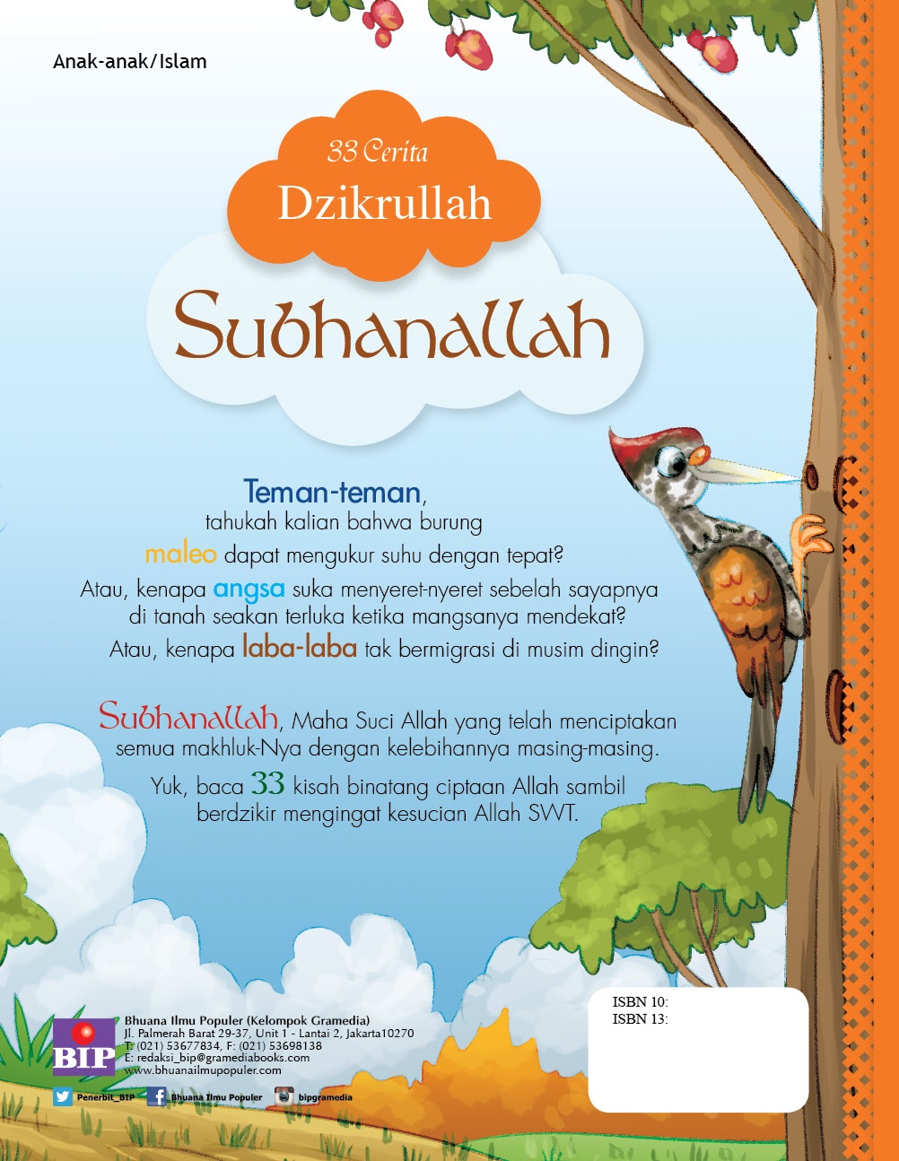 Seri 33 Cerita Dzikrullah adalah seri buku cerita yang berlandaskan kalimat dzikir, yakni Subhanallah, Alhamdulillah, dan Allahu Akbar. Tiga puluh tiga cerita yang ditawarkan akan mengenalkan anak pada nilai-nilai Islam. 33 cerita Dzikrullah: Subhanallah berisikan kumpulan cerita binatang ciptaan Allah yang berhubungan dengan perilaku manusia sehari-hari dan keistimewaan unik binatang-binatang tersebut. Di setiap akhir cerita, terdapat renungan mengenai kebesaran Allah dan nukilan ayat Al-Qur'an atau Hadits.